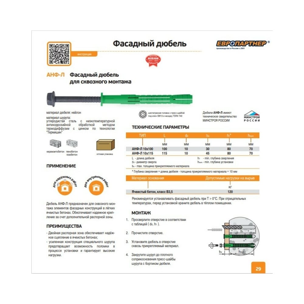 Фасадный дюбель для легкого бетона ЕВРОПАРТНЕР АНФ-Л 10x100 ШГ, 4 шт. 11 0083 3