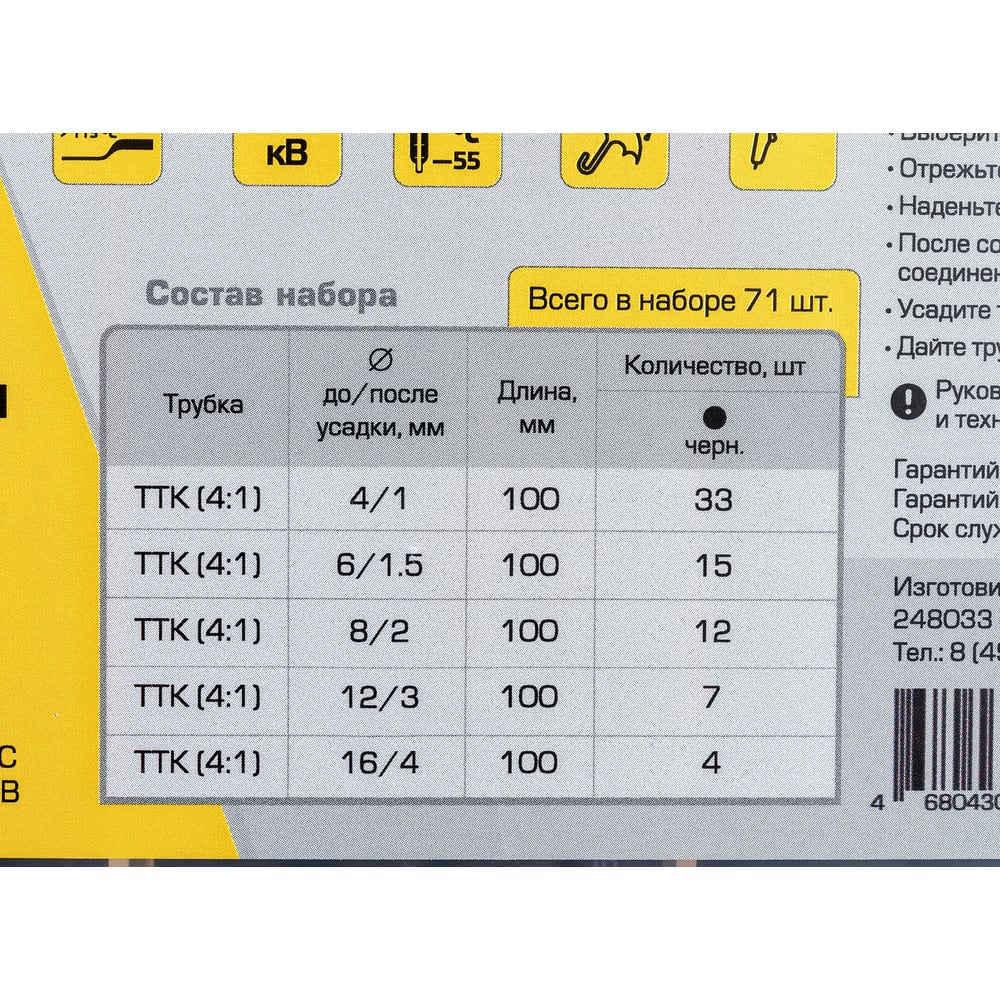 | Номинальный диаметр до/после усадки | 4.8/1.6; 6.4/2.1; 9.5/3.2; 12.7/4.2 мм |