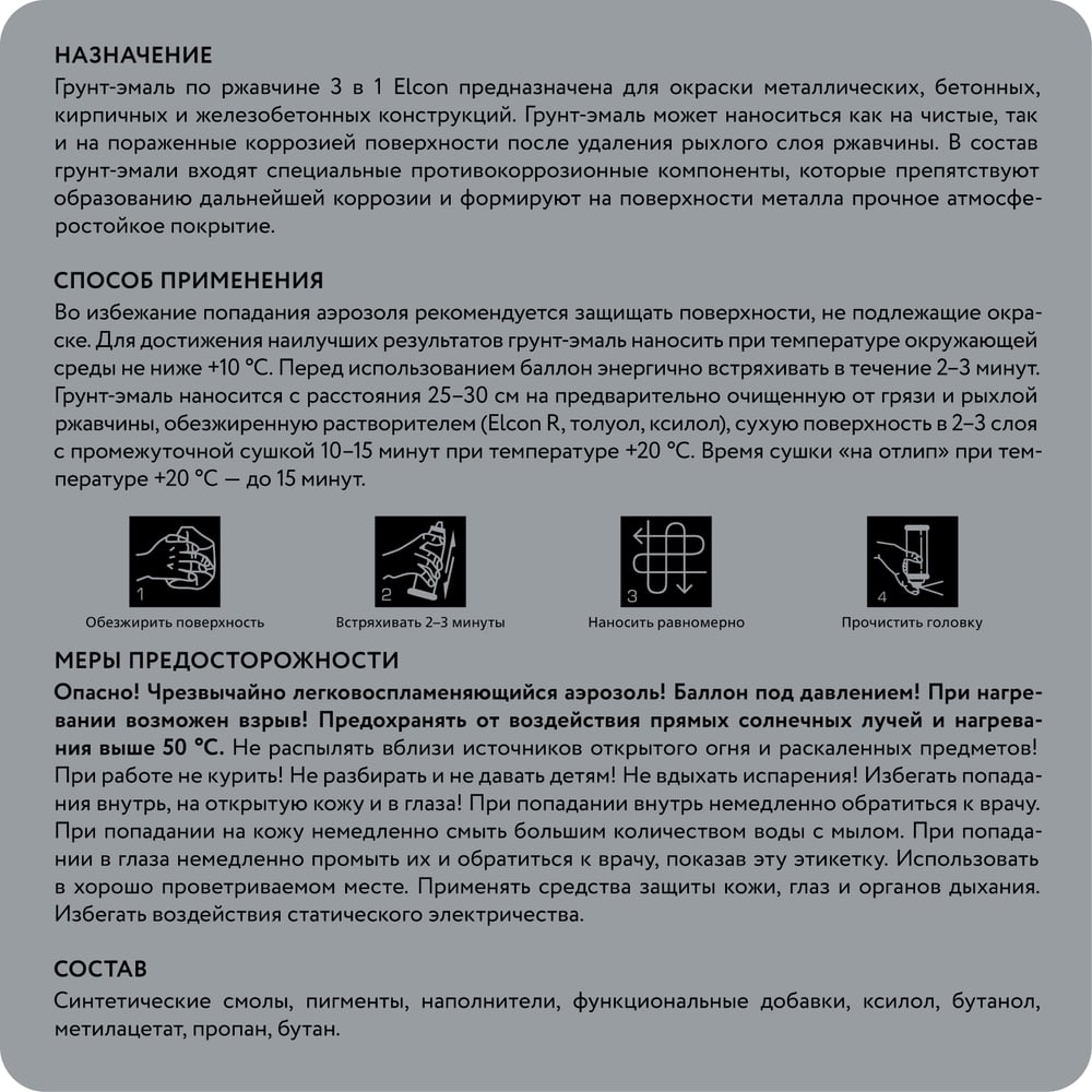 | Свойства | преобразователь ржавчины/антикоррозионный грунт/износостойкий финишный слой |