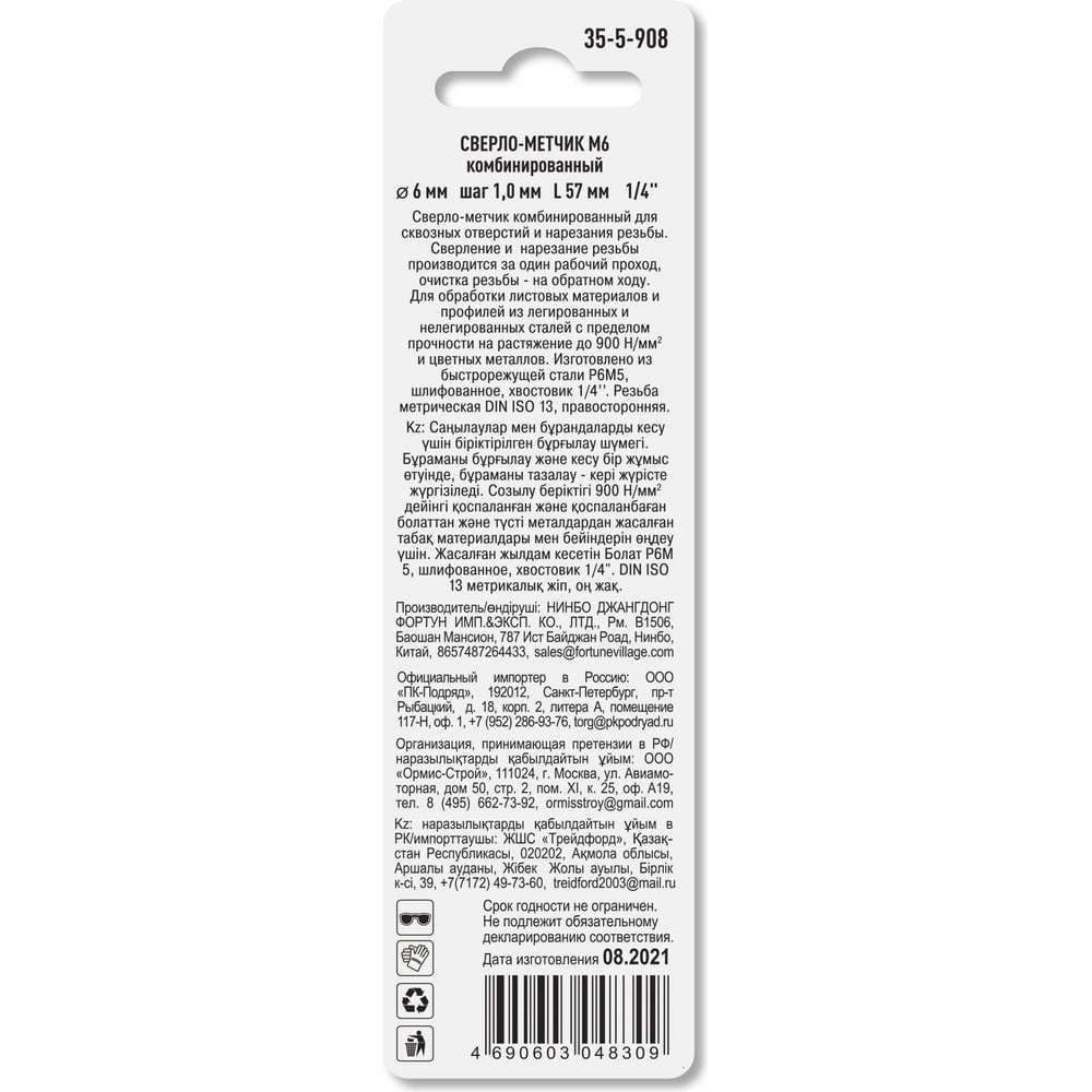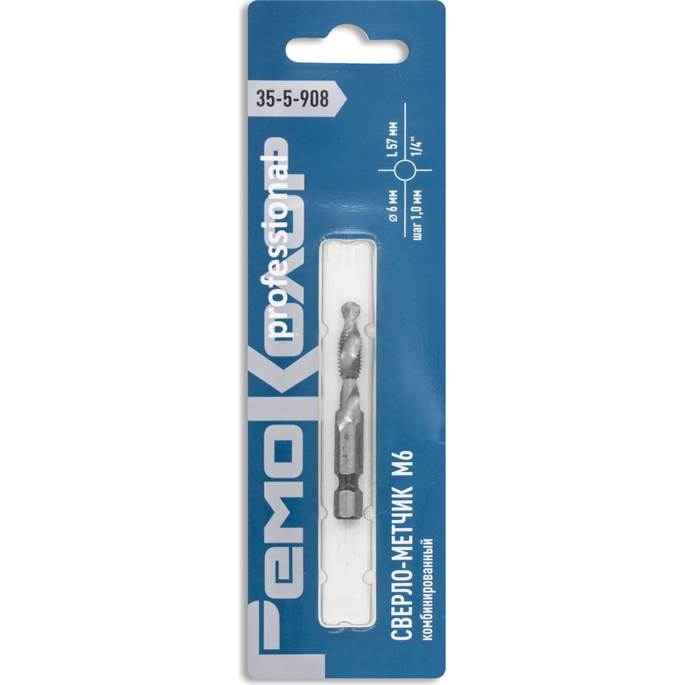 Сверло-метчик комбинированный М6, 6 мм, шаг 1 мм, длина 57 мм, хвостовик 1/4", РемоКолор 35-5-908