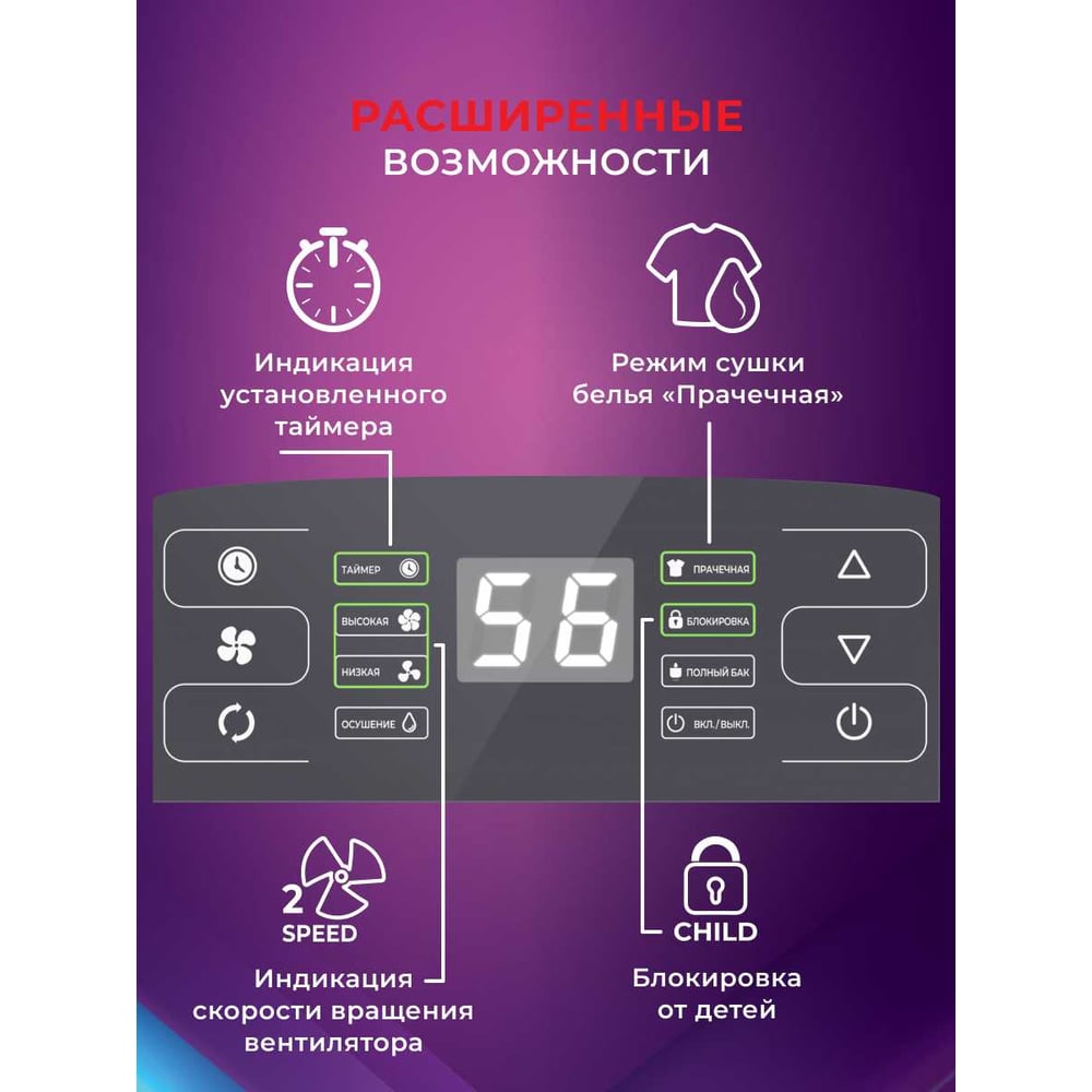 Габариты без упаковки 342x561x251 мм Тип установки мобильный Вес нетто 15 кг Напряжение питания 220 В Номинальный ток 1.34 А Мощность (Вт) 310 Таймер да Уровень шума 47 дБ Рекомендуемая площадь 29 м² Наличие датчика влажности да Пульт ДУ нет Расход воздуха 250 м³/ч Работа по Wi-Fi нет Объем бака для сбора конденсата 4 л Производительность 20 л/сут Тип осушителя конденсационный Функция ионизации воздуха нет