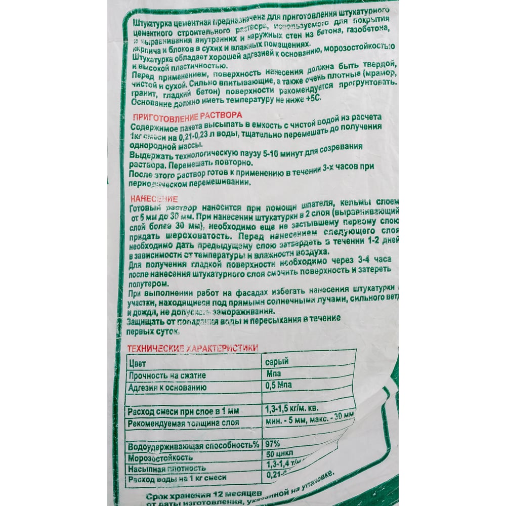 | Расход воды на 1 кг сухой смеси | 0.23 л |