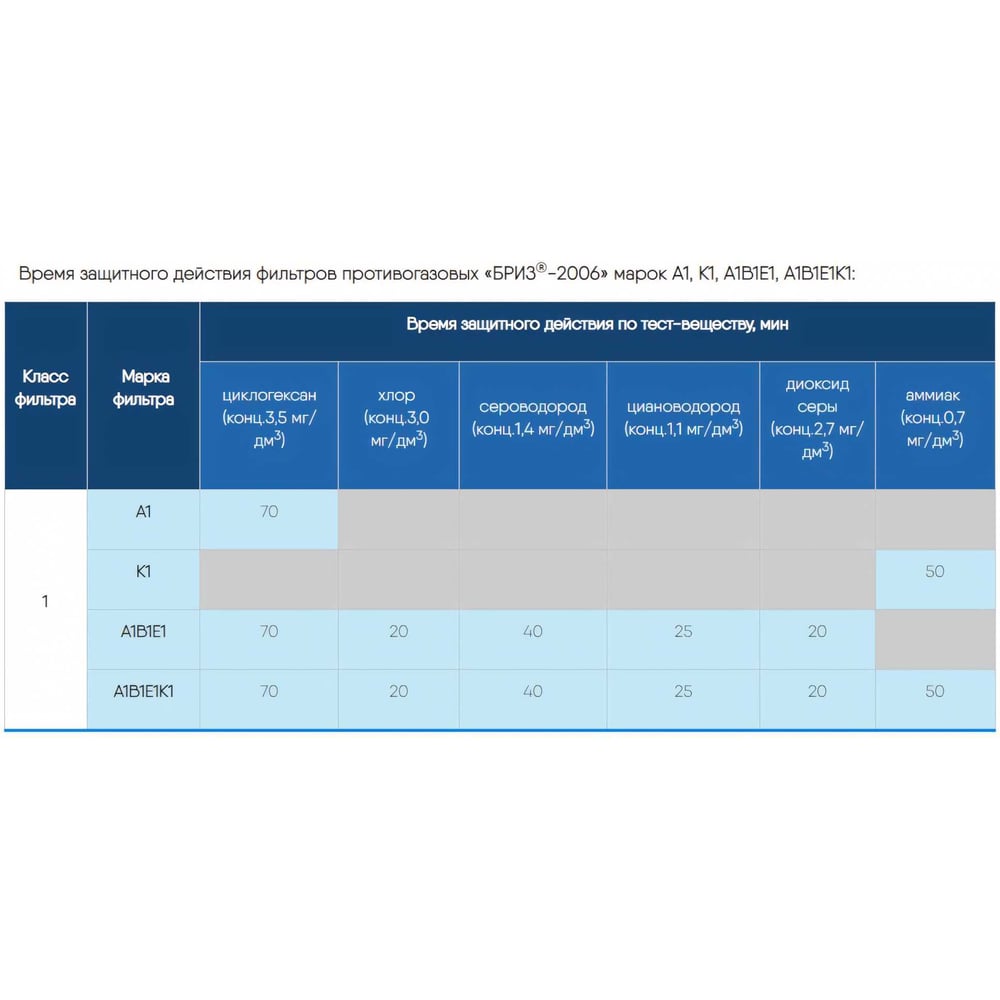 | Защитные свойства | от органических газов и паров с температурой кипения выше 65 оС, неорганических газов и паров (за исключением оксида углерода), диоксида серы и других кислых газов, аммиака и его органических производных |