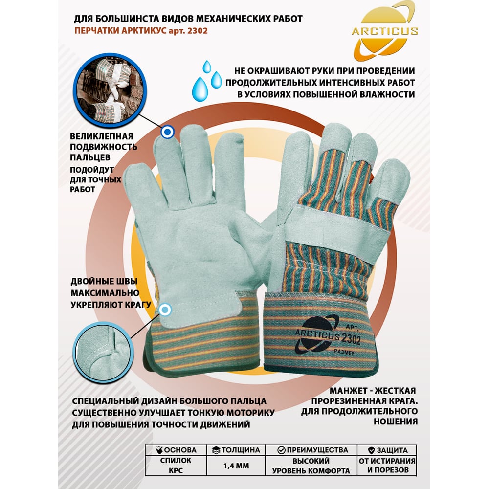 Комбинированные перчатки ARCTICUS серые, спилок КРС ВС кл, х/б подкладка, крага 2302-111