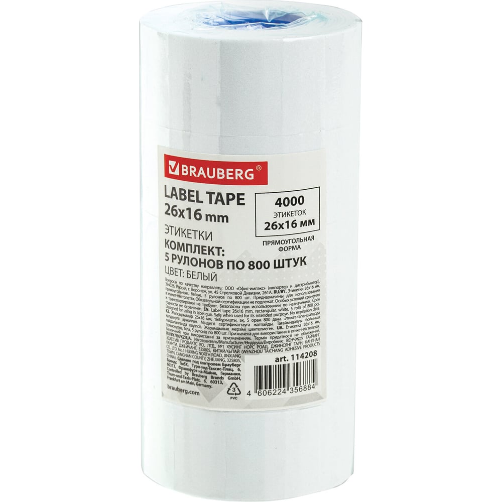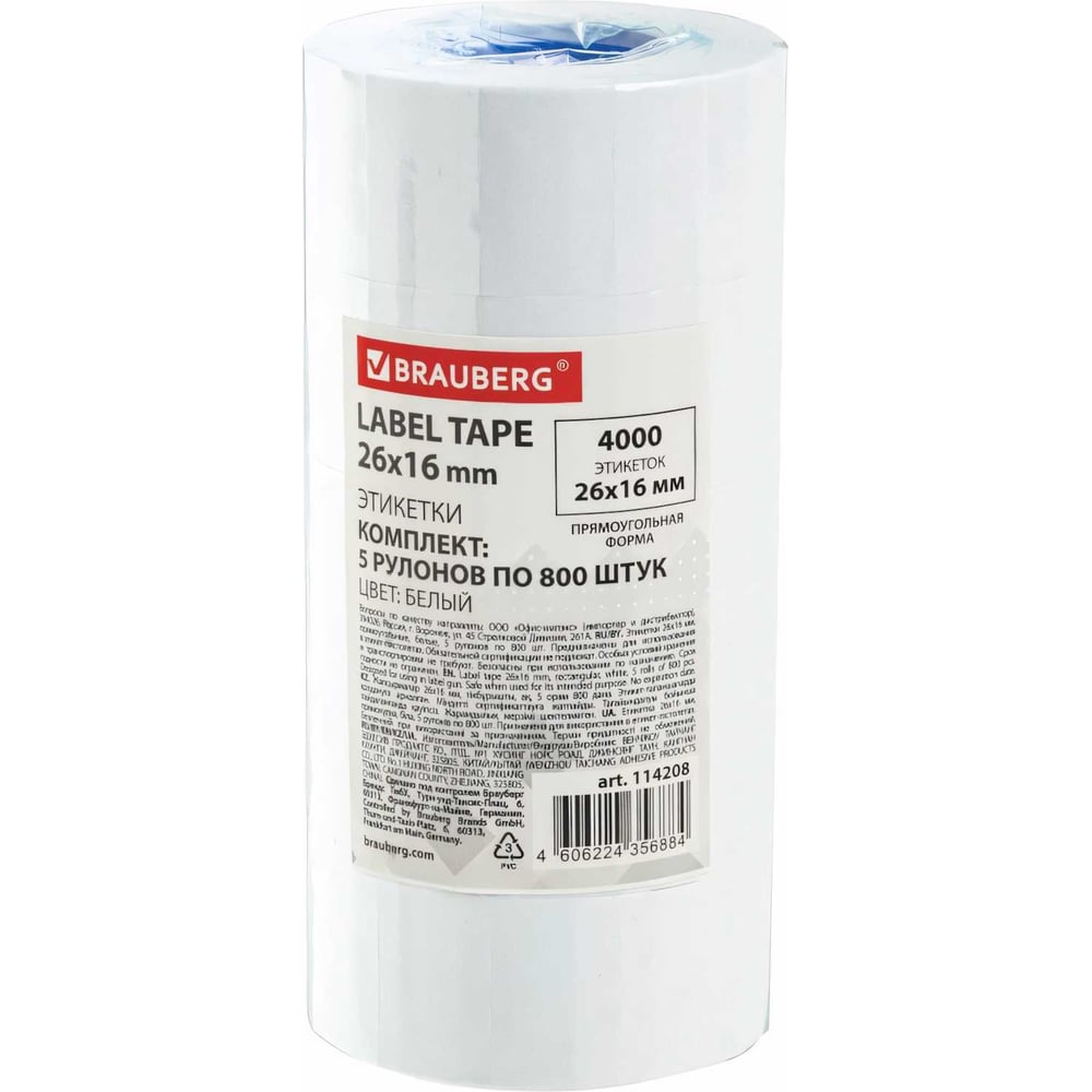 Этикет-лента BRAUBERG 26x16 мм, прямоугольная, белая, комплект 5 рулонов по 800 шт. 114208