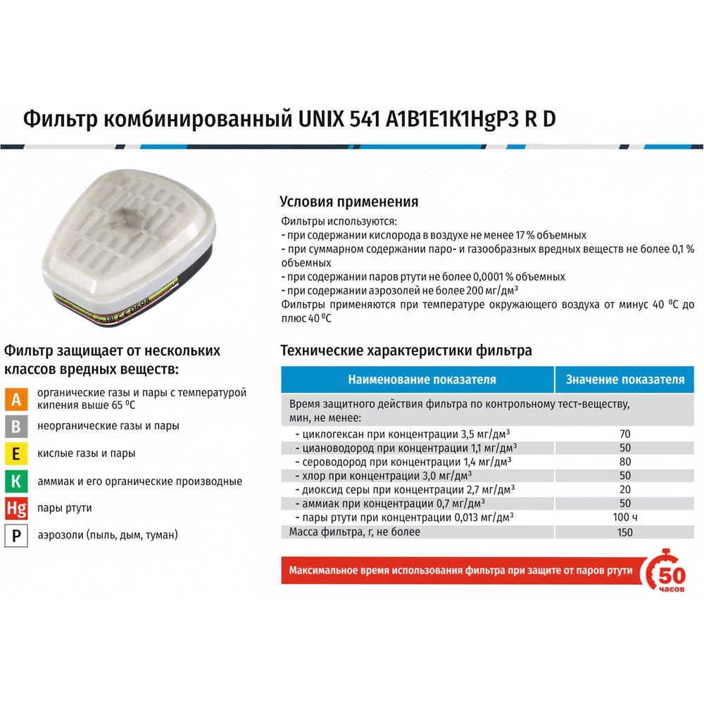 | Защитные свойства | от органических газов и паров с температурой кипения выше 65 оС, неорганических газов и паров (за исключением оксида углерода), диоксида серы и других кислых газов, аммиака и его органических производных, паров ртути и аэрозолей |
