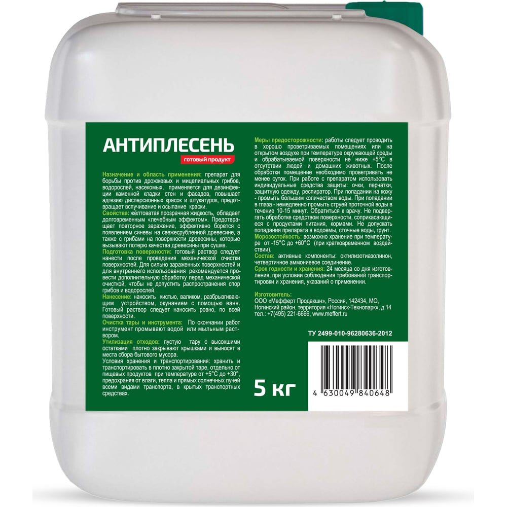 | Условия хранения | Хранить в плотно закрытой таре, отдельно от пищевых продуктов при температуре от +5°С до +30°. |