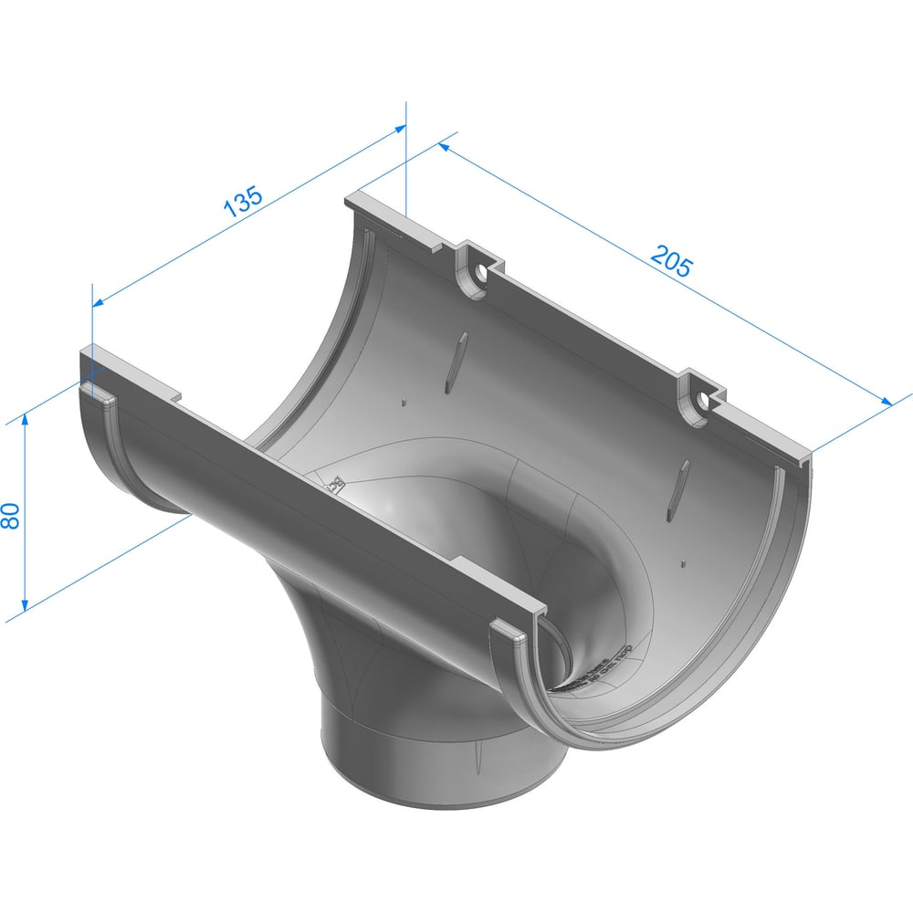 Длина 205 мм Материал ПВХ Ширина 135 мм Цвет серый Вес нетто 0.18 кг Коллекция STANDARD Температура эксплуатации ОТ -40 ДО +50 °С Форма сечения круглая Диаметр трубы 80 мм Толщина стенок 1.7 мм Диаметр желоба 120 мм