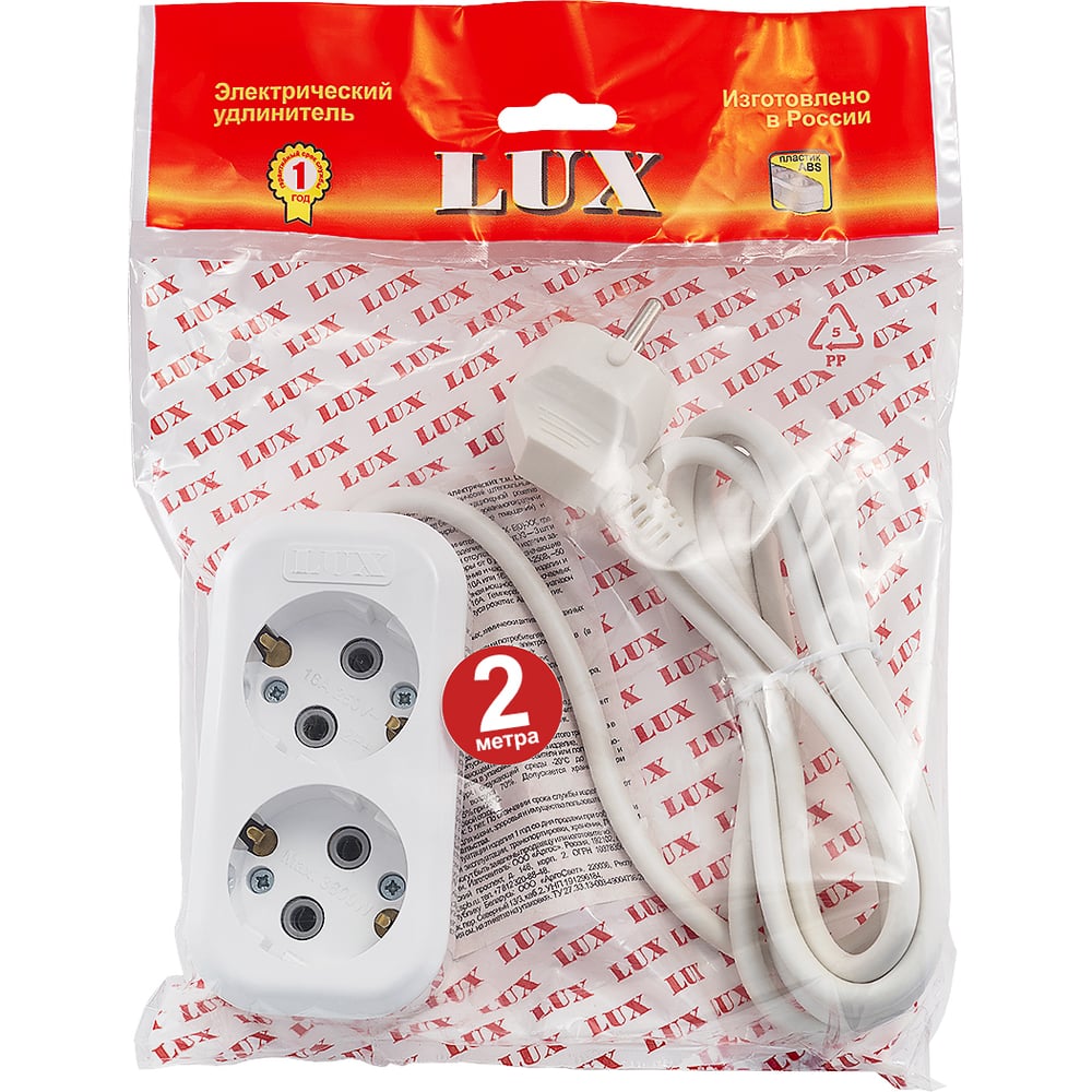 Двухместный сетевой удлинитель с заземлением LUX У2-Е, 2м, 4606400414537