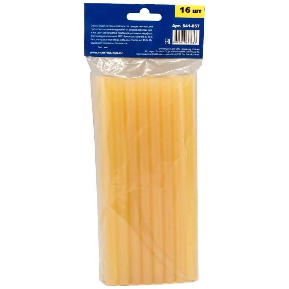 Клей желтый, прозрачный (16 шт; 11х200 мм) для клеевого пистолета ПРАКТИКА 641-657