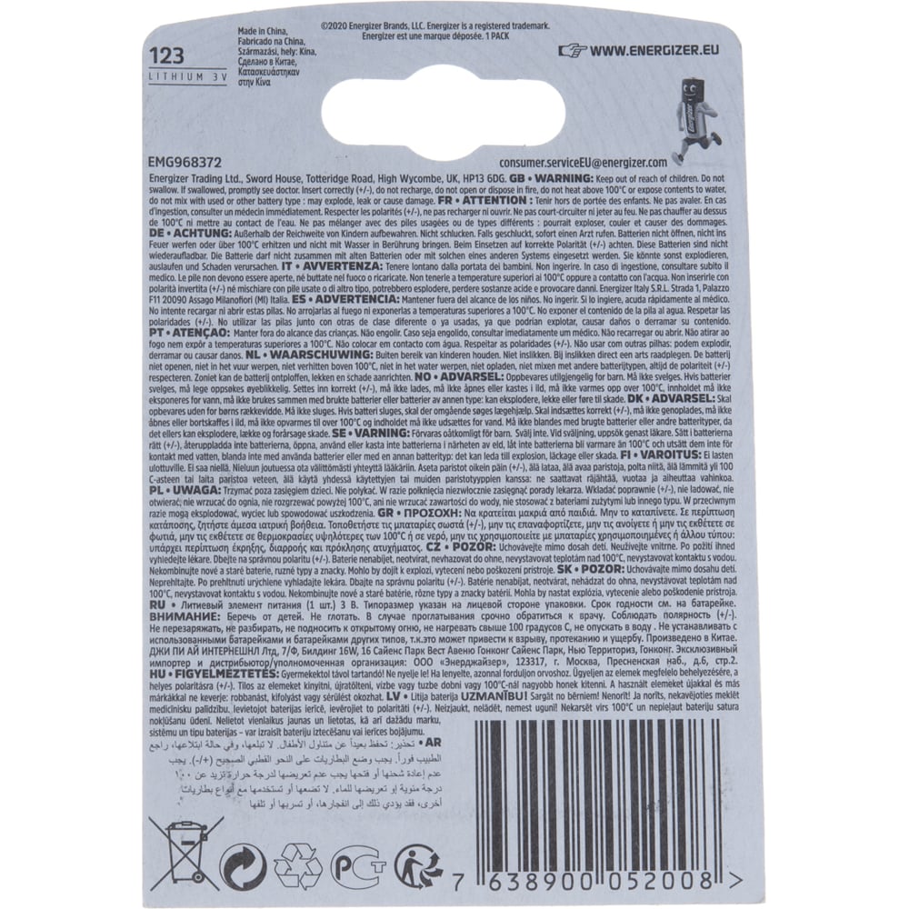 Литиевая батарейка ENERGIZER 123A бл/1 7638900052008