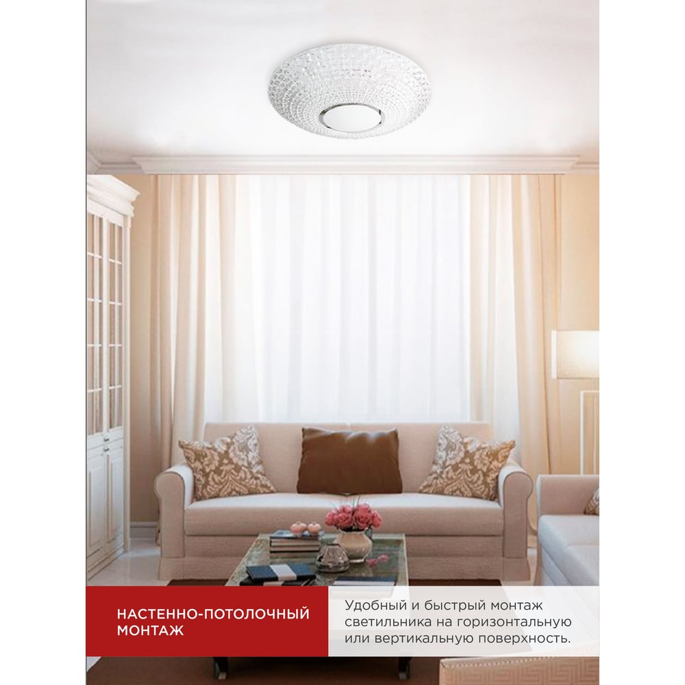 Габариты без упаковки 400х400х100 мм Лампа в комплекте есть Поверхность плафона/арматуры глянцевая/матовая Цвет плафона/арматуры прозрачный/белый Вес нетто 1.45 кг Мощность светильника 55 Вт Цоколь встроенные светодиоды(LED) Тип лампы встроенные светодиоды Цветность регулируемый (3000-6500 К) Защита от пыли и влаги IP20 Материал корпуса металл Материал плафона пластик Вид крепления накладной Длина 40 см Ширина 10 см Форма корпуса круг Влагозащищенный нет Пылезащищенный нет Световой поток 4400 Лм Тип колбы плата LED Высота 10 см Провод без провода Основной цвет белый Min температура эксплуатации 1 °С Max температура эксплуатации 40 °С Диаметр 40 см Количество и напряжение элементов питания 220В Климатическое исполнение УХЛ4 Элементы питания сеть Взрывозащищенный нет Термостойкость нет Датчик движения нет Защитная решетка нет Датчик звука нет Вандалоустойчивость нет С пультом управления да