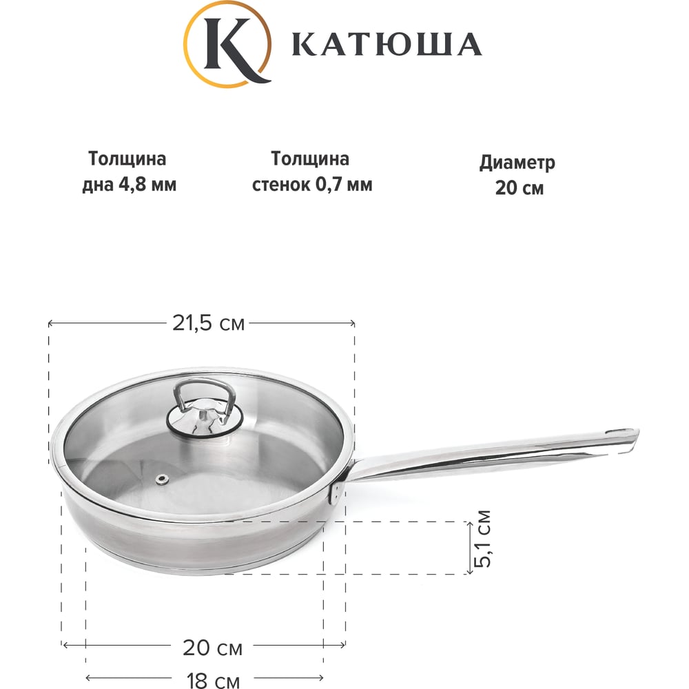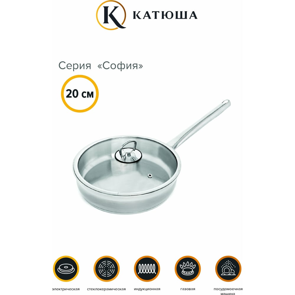 Сковорода Катюша София нержавеющая сталь, 20 см, стекл. крышка, арт.29910-200-0
