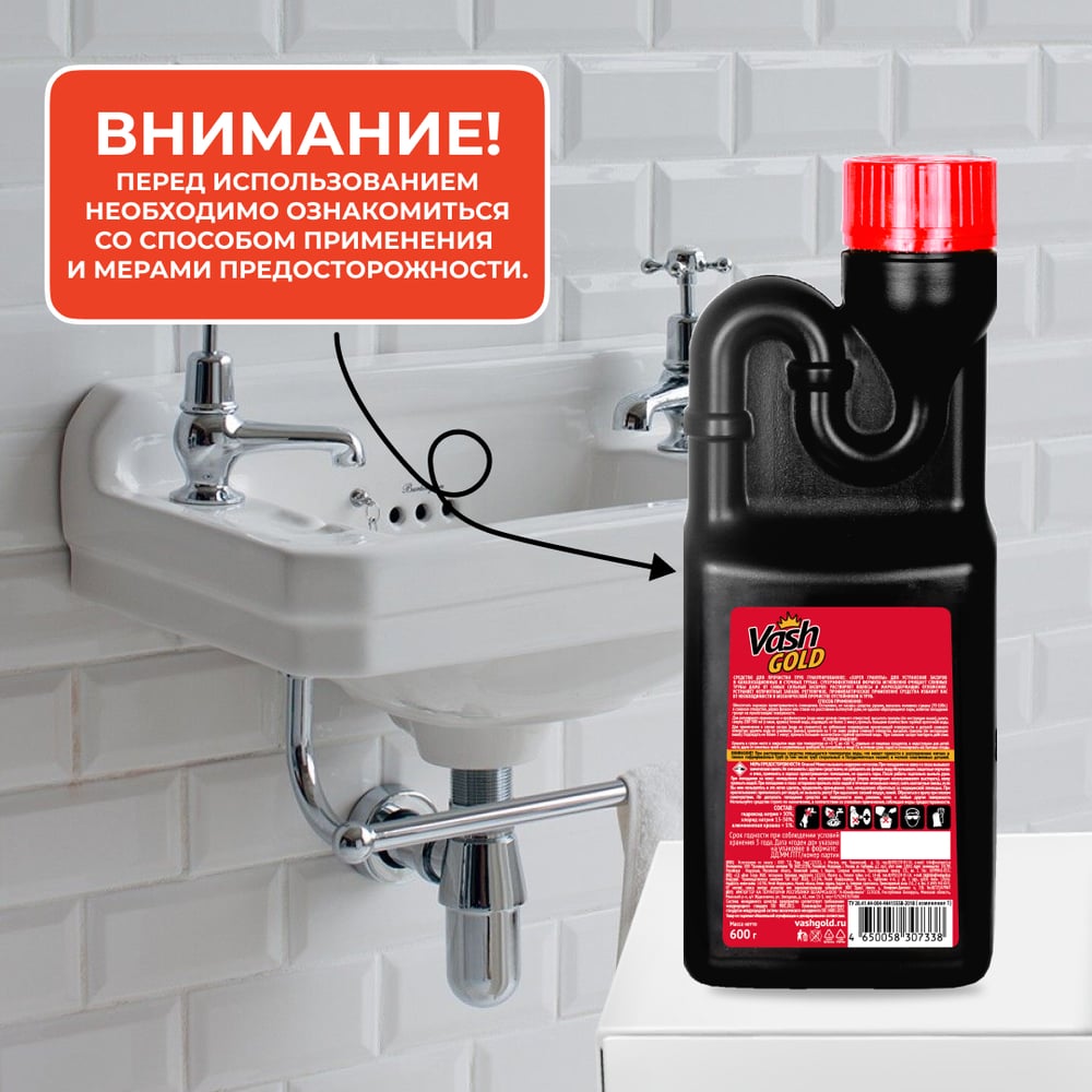 Средство для прочистки труб VASH GOLD Super гранулированное, от засоров, 600 гр 307338