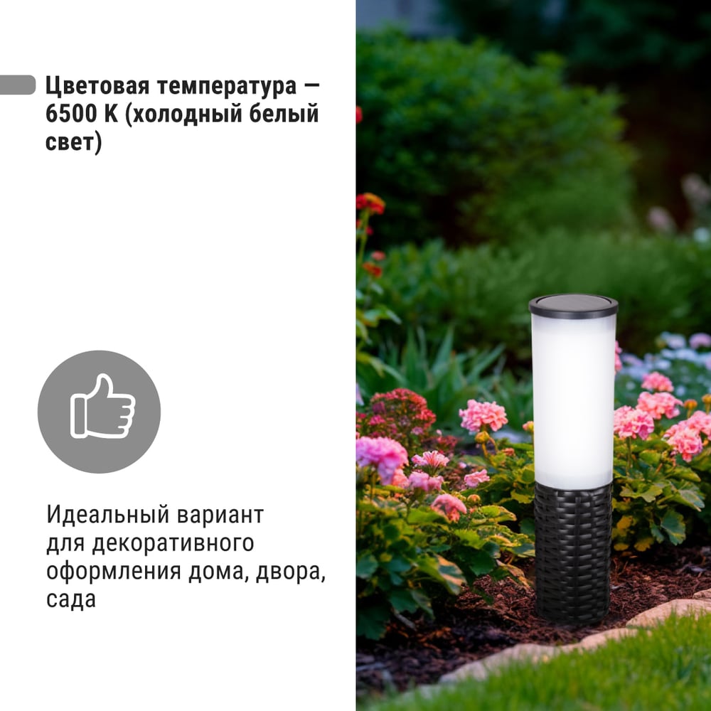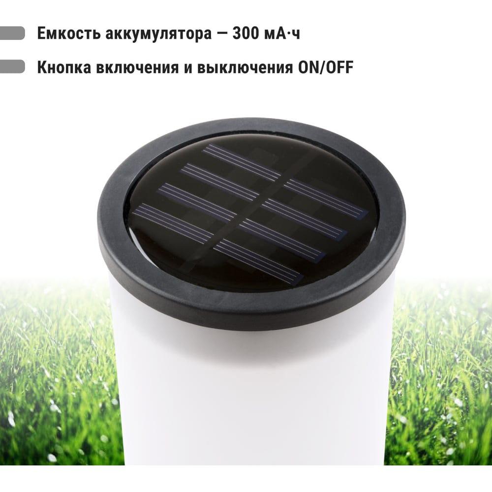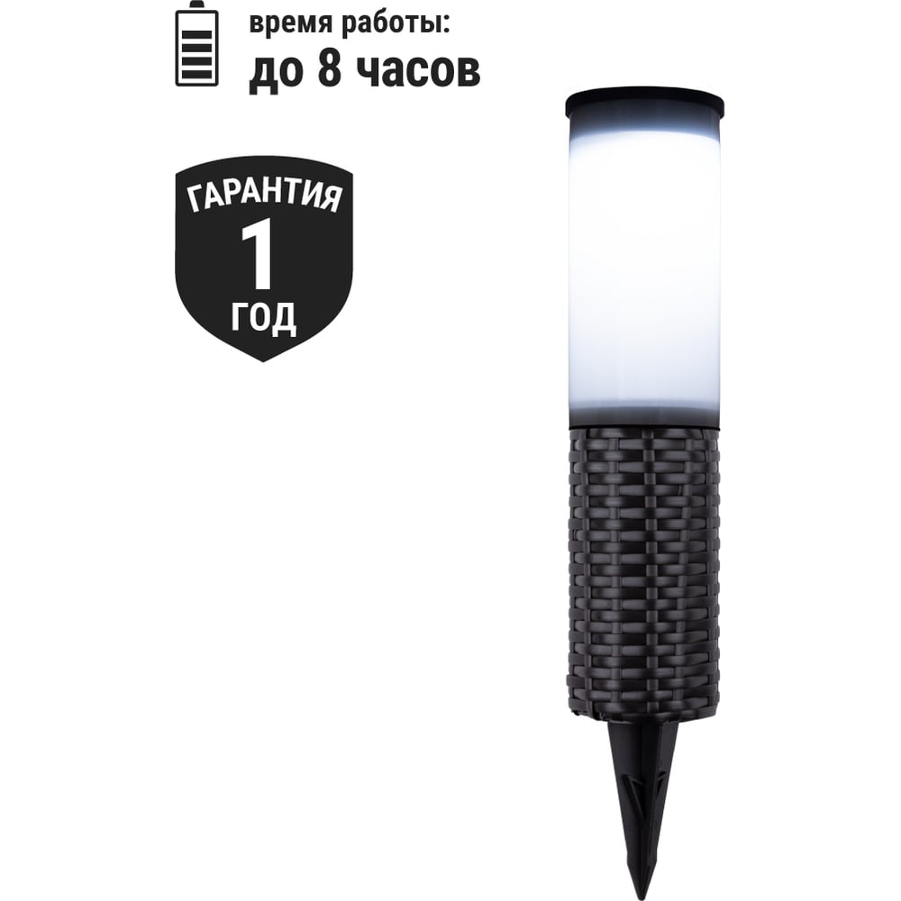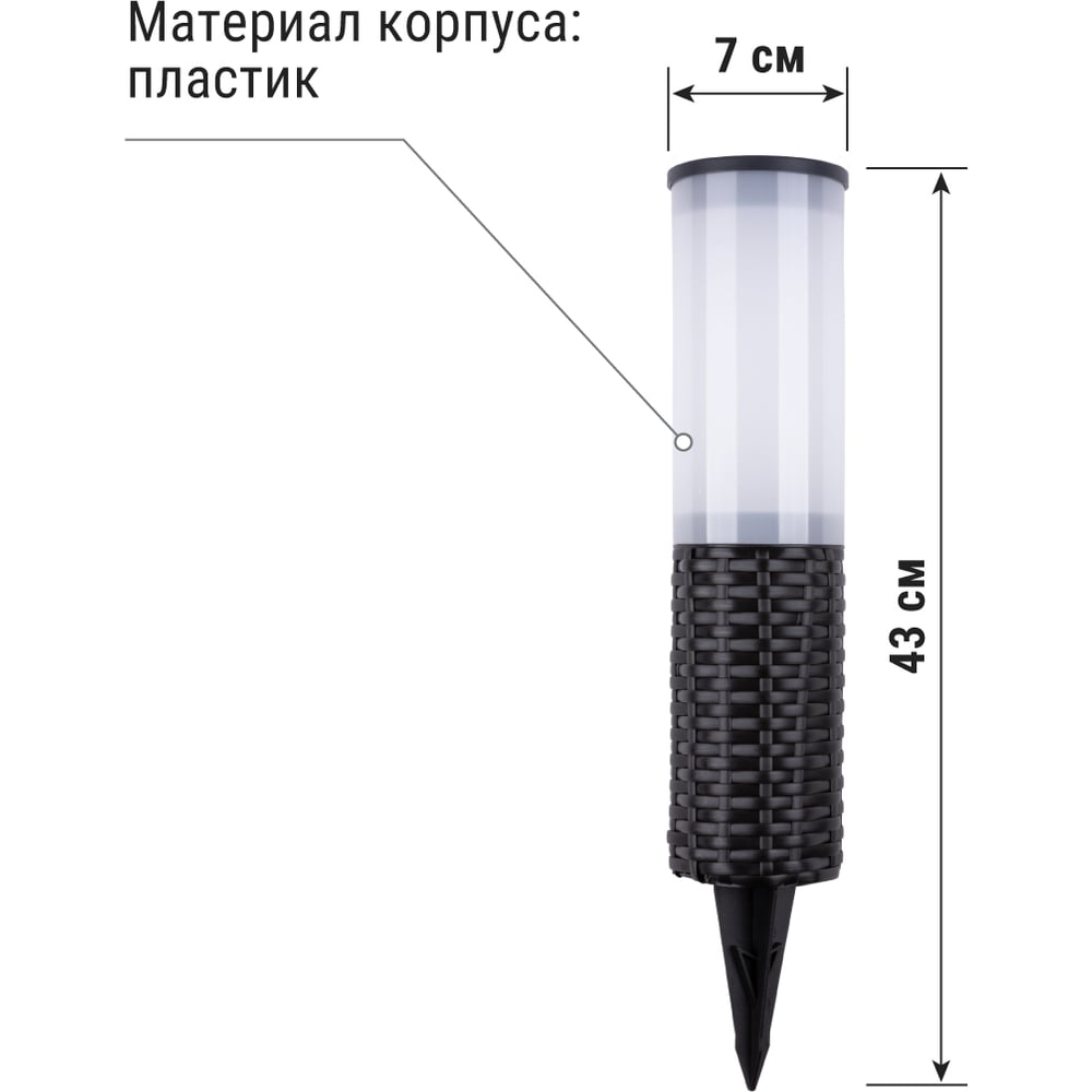 Габариты без упаковки 430х70 мм Тип грунтовые Лампа в комплекте есть Вес нетто 0.35 кг Мощность светильника 0.24 Вт Цоколь встроенные светодиоды (LED) Тип лампы встроенные светодиоды Цветность естественный белый (3300-5000 К) Напряжение питания 1.2 В Защита от пыли и влаги IP44 Материал корпуса пластик Материал плафона пластик Вид крепления штырь Коллекция ротанг Цвет плафона белый Цвет корпуса черный Провод без провода Питание солнечная батарейка Количество ламп 2 шт Датчик движения нет Мощность лампы 0.12 Вт Датчик освещенности да Высота/длина 430 мм Ширина изделия 70 мм Возможность подключения диммера нет