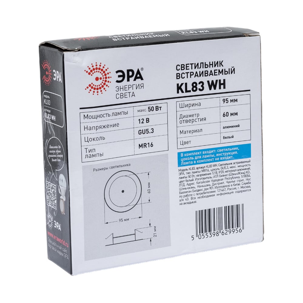 Встраиваемый алюминиевый светильник ЭРА KL83 WH Б0054344