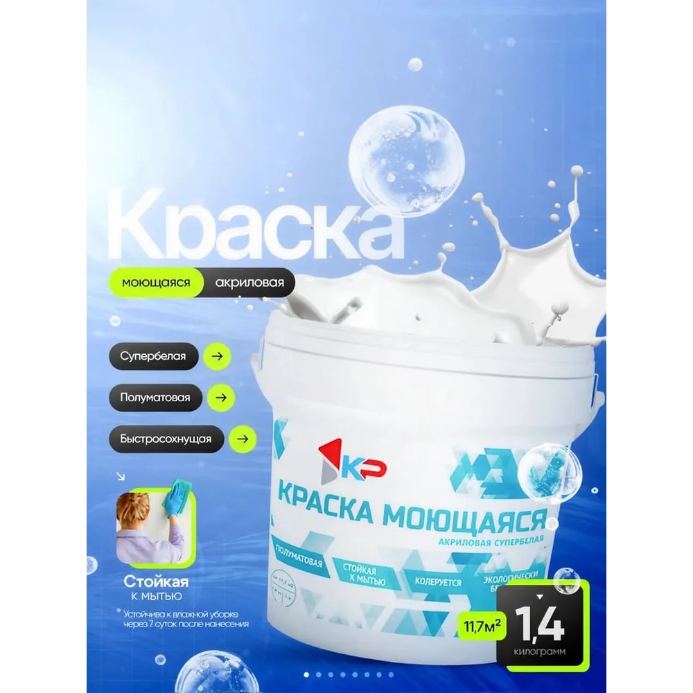 Краска моющаяся быстросохнущая, акриловая, полуматовое покрытие КР 1,4 кг, белый 4300009170
