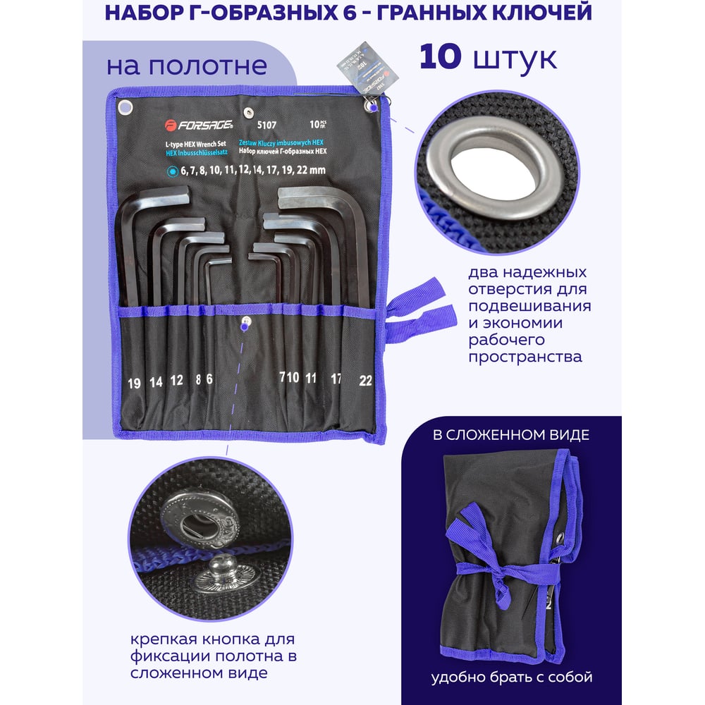Набор Г-образных 6-гранных ключей Forsage 10 предметов на полотне F-5107(18814)