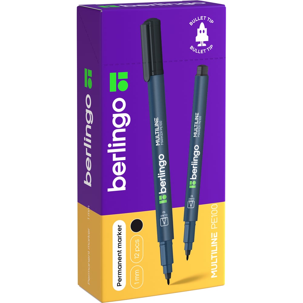 Маркер перманентный Berlingo "Multiline PE100" черный, пулевидный, 1мм, 12 шт. PM6324
