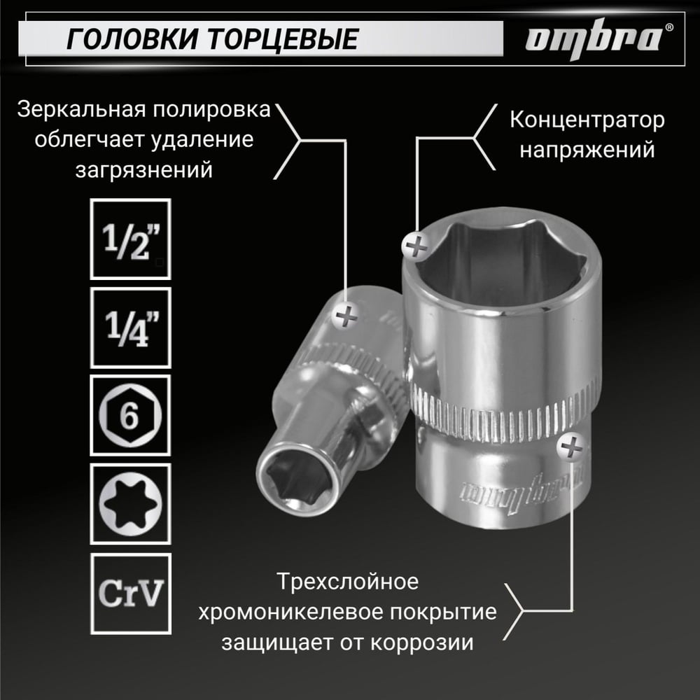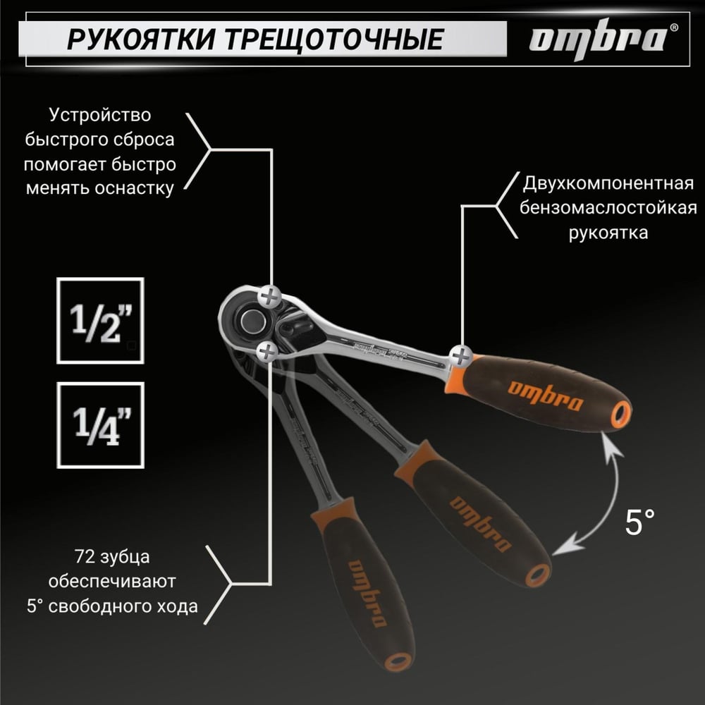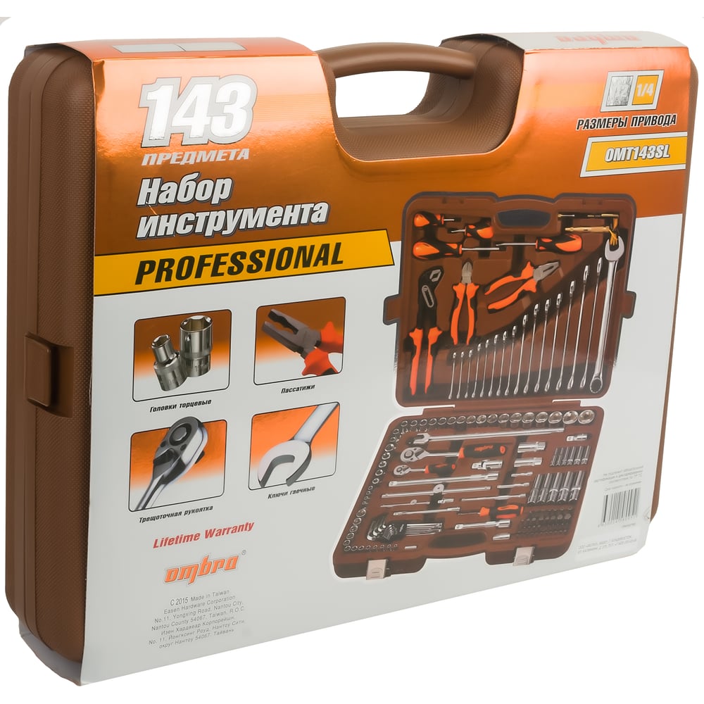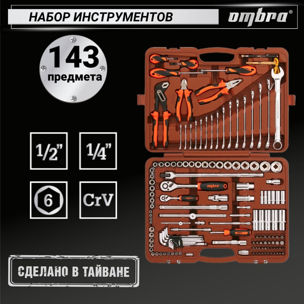 Универсальный набор инструмента торцевые головки Ombra OMT143SL 1/4DR и 1/2DR, аксессуары к ним, ШГИ, отвертки и комбинированные ключи, 143 предмета. 55565 055565