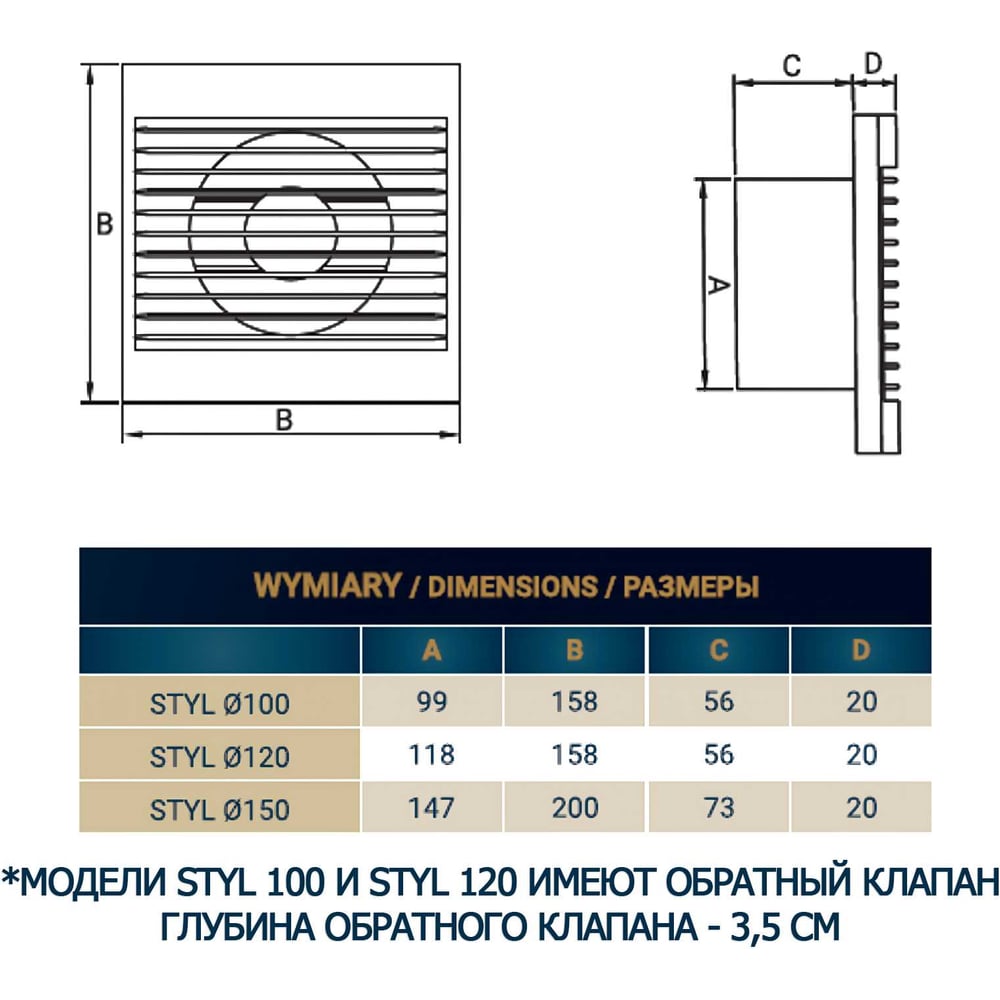 Габариты без упаковки 158х158х76 мм Высота 158 мм Ширина 158 мм Цвет белый Тип установки настенный Вес нетто 0.5 кг Материал корпуса ABS-пластик Серия STYL Напряжение 220 В Мощность (Вт) 17 Класс защиты IPХ4 Min температура эксплуатации 0 °С Max температура эксплуатации 40 °С Производительность 150 м³/ч Количество скоростей 1 Диаметр воздуховодов 120 мм Уровень шума 46 дБ Установочная высота 108 мм Наличие датчика влажности нет Наличие таймера нет Москитная сетка есть Обратный клапан есть Вид канала круглый Тип выключателя нет Защита от перегрева да Тип конструкции осевой Брызгозащищенное исполнение нет Установочная длина 108 мм Съемная панель да Монтажная глубина 86 мм Тип подшипника скольжения Наличие датчика движения нет