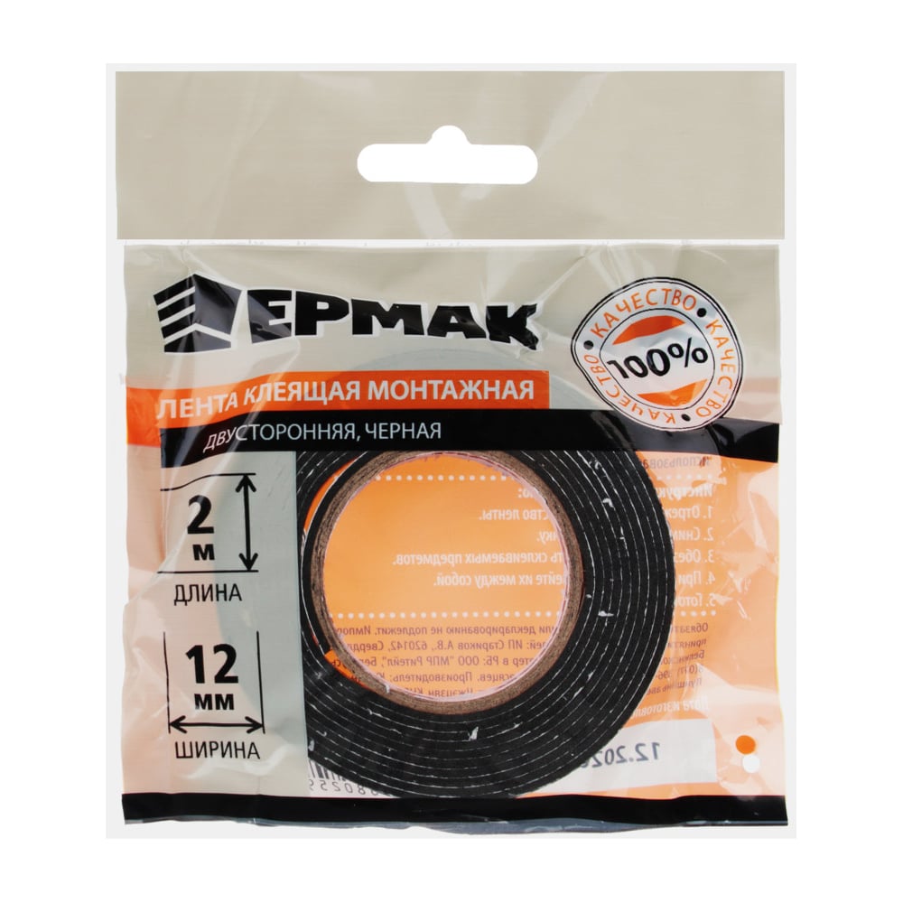 Монтажная 2-х сторонняя клеящая лента ЕРМАК для АВТО, 12 мм x 2 м, черная 472-015