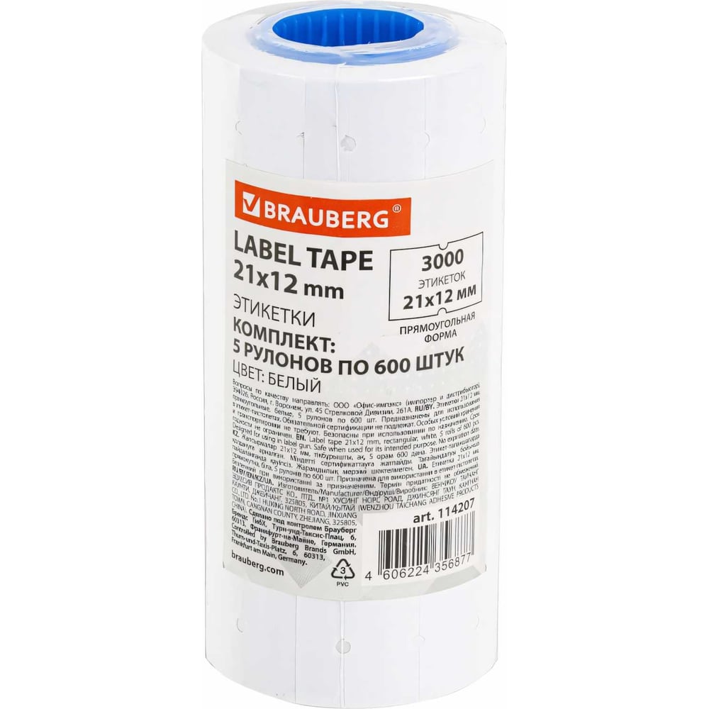Этикет-лента BRAUBERG 21x12 мм, прямоугольная, белая, комплект 5 рулонов по 600 шт. 114207