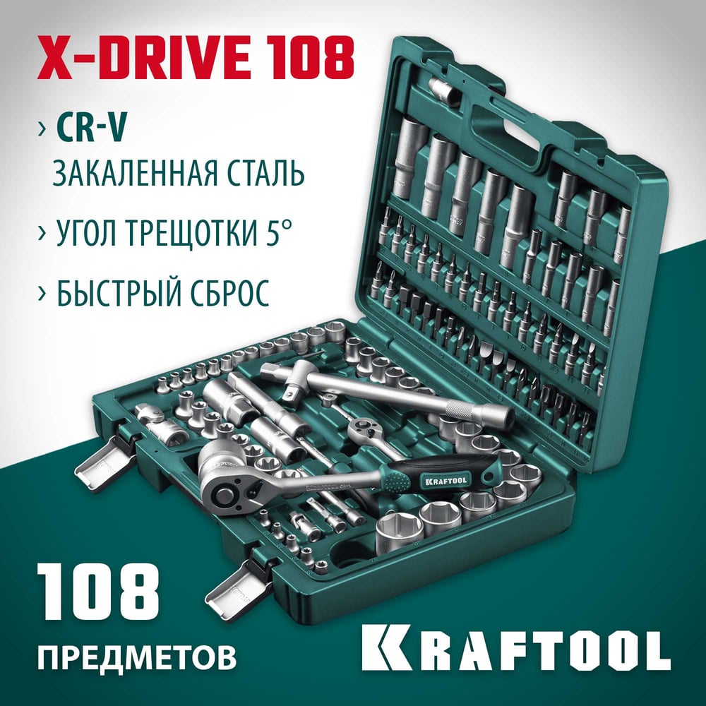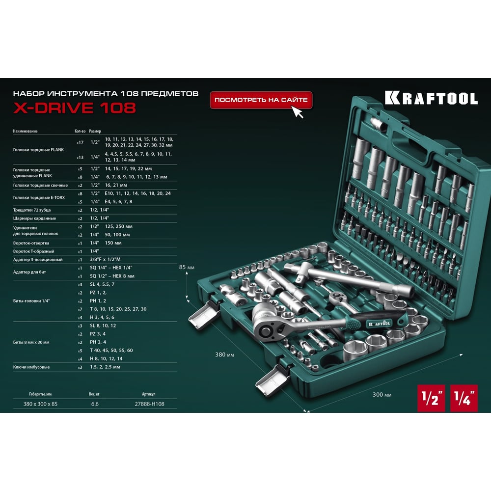 Универсальный набор инструмента KRAFTOOL X-Drive 108, 108 предм., (1/2"+3/8"+1/4") 27888-H108_z03