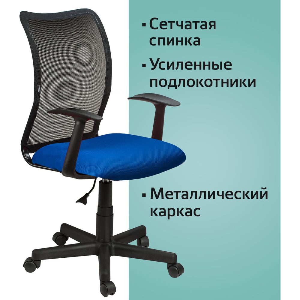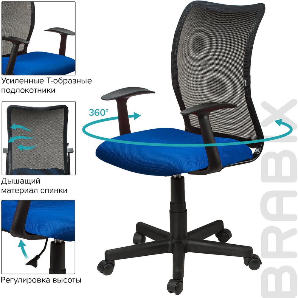 Стиль современный Требует сборки да Подлокотники да Подъемный механизм да Механизм качания нет Регулировка высоты спинки нет Механизм вращения да Подголовник нет Подставка для ног нет Max нагрузка 90 кг Ширина сиденья 450 мм Глубина сиденья 450 мм Ширина спинки 440 мм Высота спинки 540 мм Min высота сиденья 470 мм Мах высота сиденья 590 мм Цвет спинки черный/синий Материал крестовины пластик Материал подлокотников пластик Цвет сиденья черный/синий Материал обивки сетка, текстиль Колеса есть