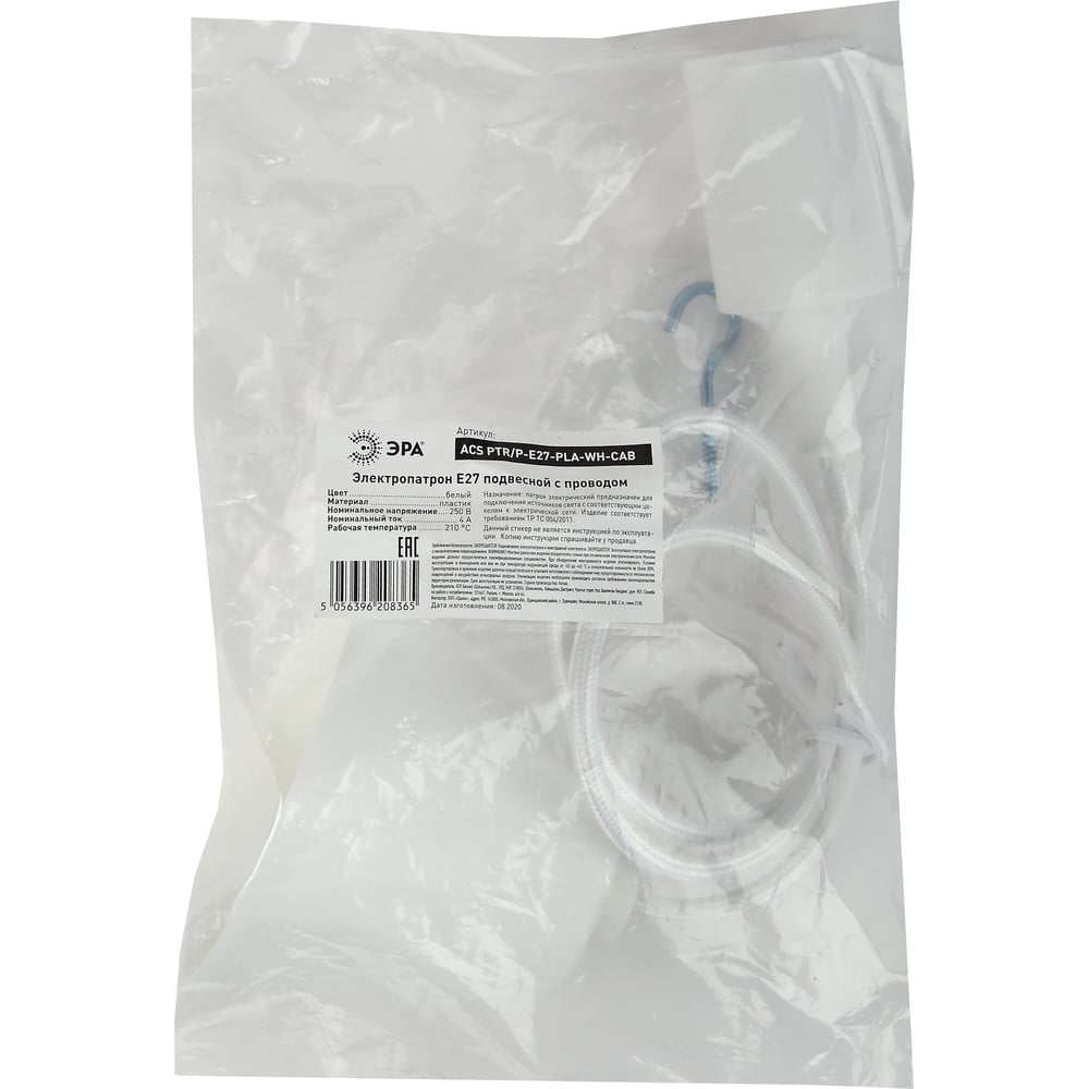 Патрон с подвесом ЭРА Е27, пластиковый, белый, 60/720 Б0048038