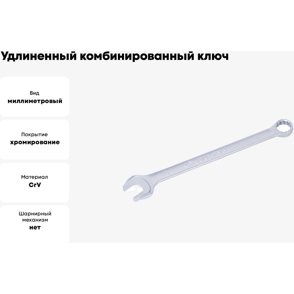 Длина 338 мм Материал CrV Покрытие хромирование Вид миллиметровый Класс товара Профессиональный Вес нетто 0.38 кг Диэлектрическое покрытие нет Трещотка нет Шарнирный механизм нет Размер max (дюйм) нет Размер min (дюйм) нет Количество граней кольцевой головки 12 Размер min (мм) 24 Размер max (мм) 24