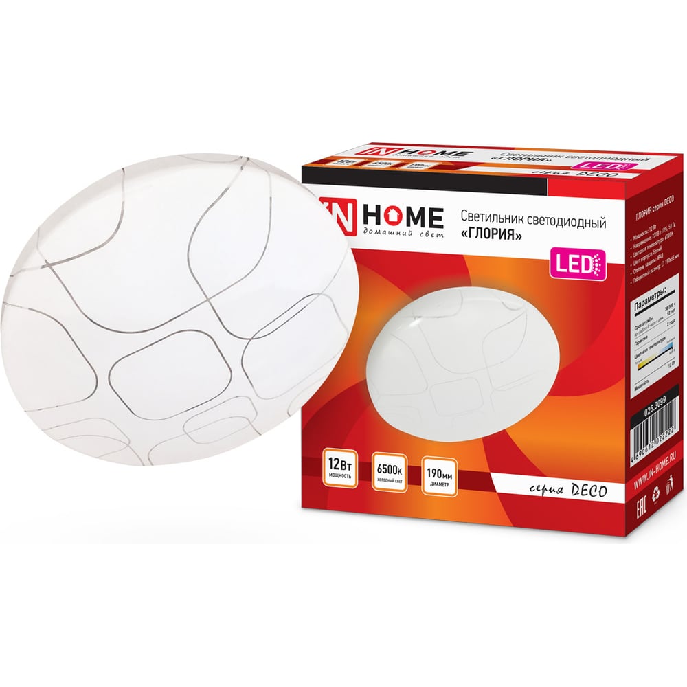 Светодиодный светильник IN HOME серии DECO 12Вт 230В 6500К 780лм 190мм ГЛОРИЯ 4690612022222