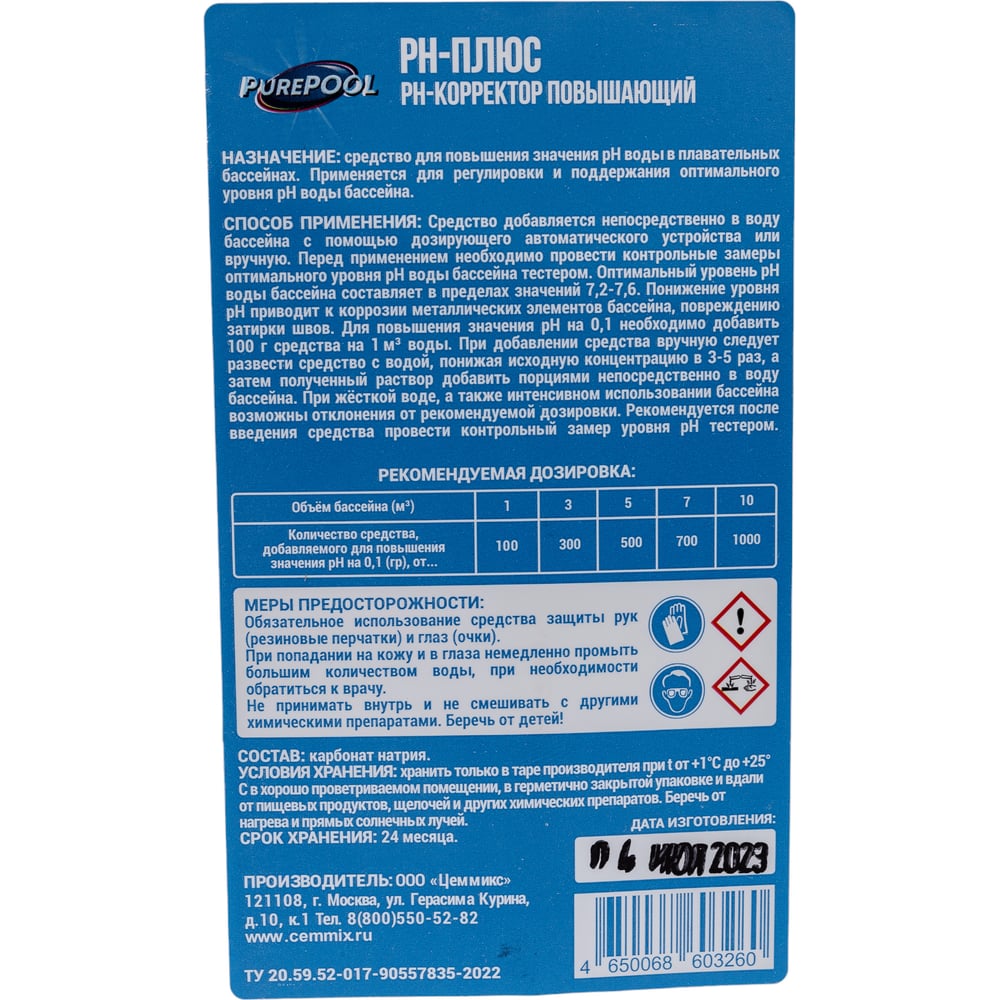| Расход | 100 г на 1 м3 воды для повышения рН на 0,1 |