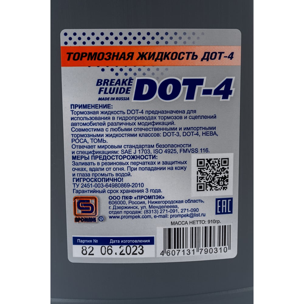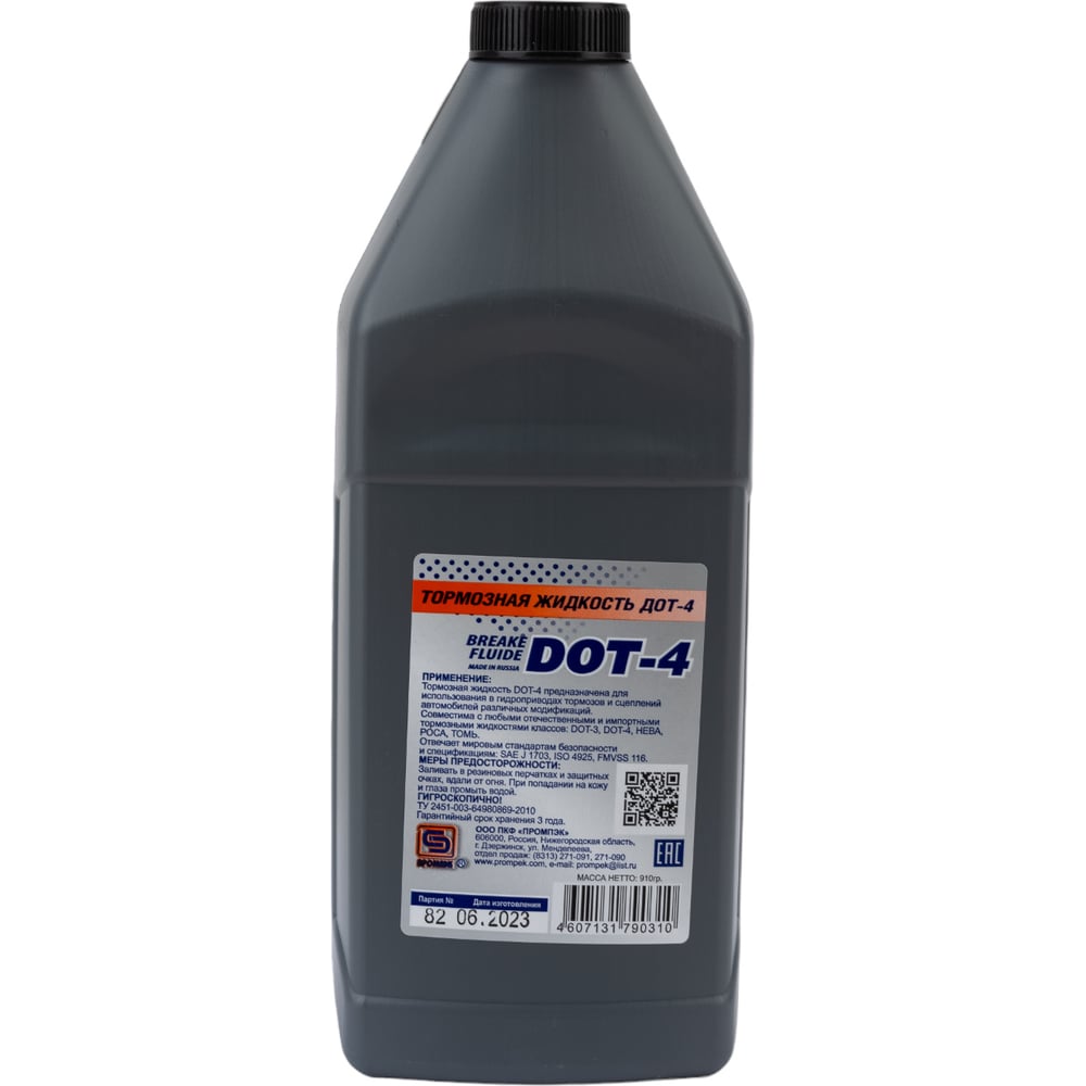 Тормозная жидкость Промпэк Дот-4, 910 г 4607131790310