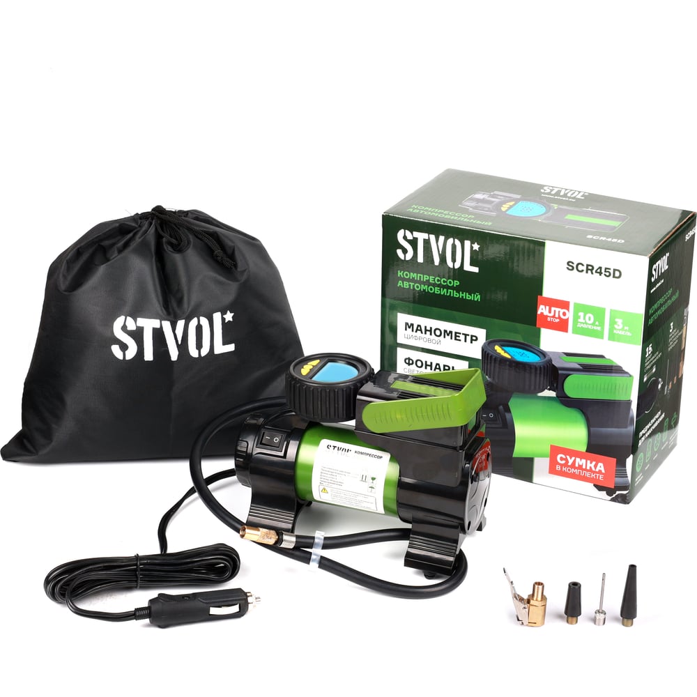 Автомобильный компрессор STVOL 45 л/мин, 14А, электронный манометр, фонарь SCR45D