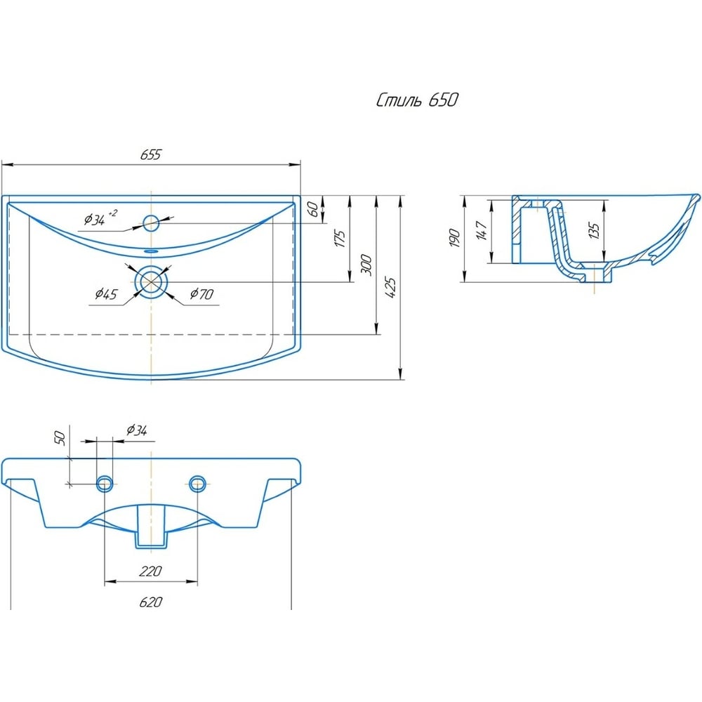 Вес нетто 14.5 кг Стиль современный Серия СТИЛЬ Мыльница нет Поверхность глянцевая Расположение крыла с обеих сторон Отверстие для перелива есть Диаметр сливного отверстия 45 мм Ширина раковины 655 мм Глубина раковины 425 мм Высота раковины 190 мм Кол-во отверстий под смеситель 1 Форма раковины полукруглая Монтаж раковины на тумбу Цвет раковины белый Материал раковины SaphirKeramik Количество чаш 1 шт Расположение смесителя посередине Для людей с ограниченными возможностями нет Полотенцедержатель нет