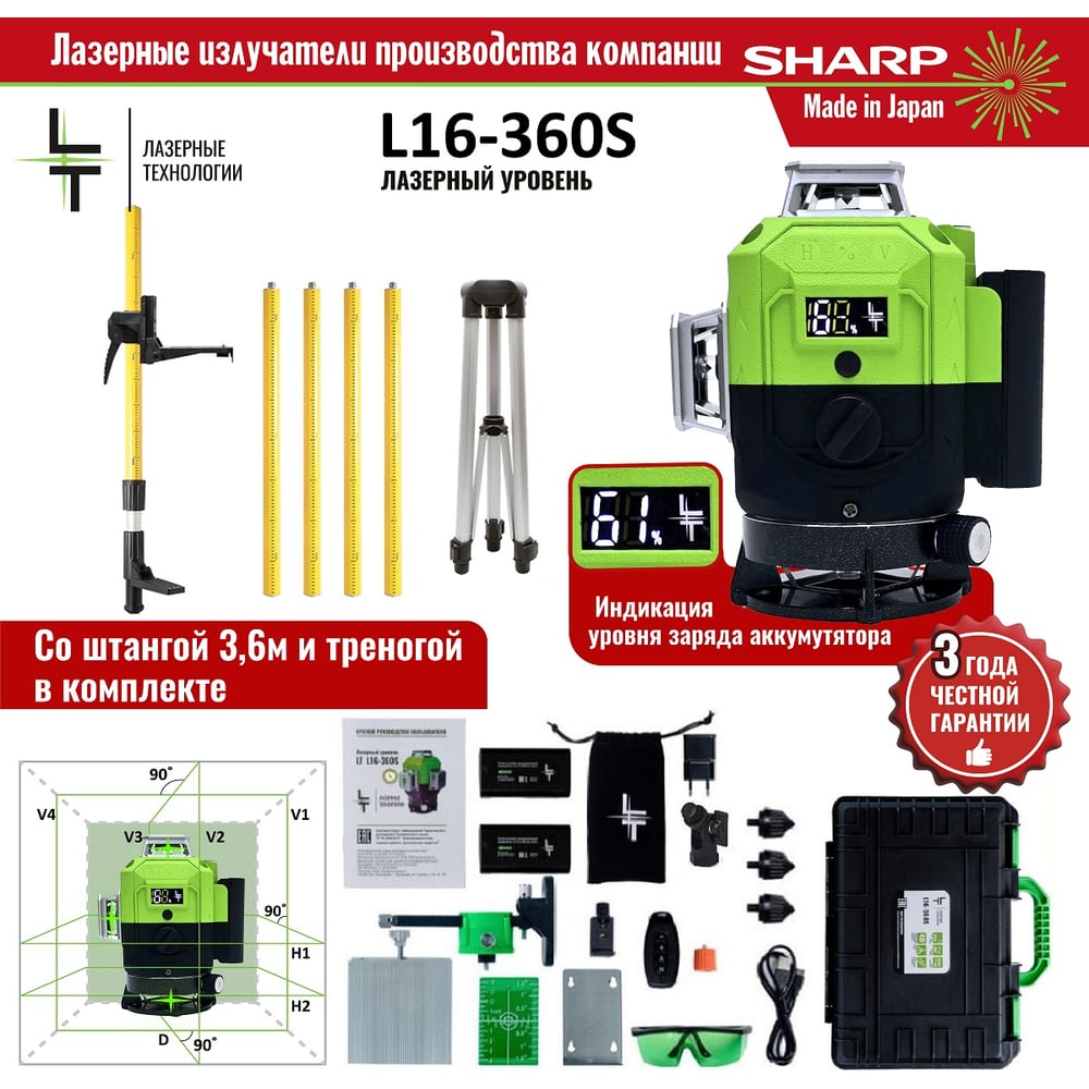 Профессиональный лазерный уровень LT + штатив с треногой L16-360S/3.6м+