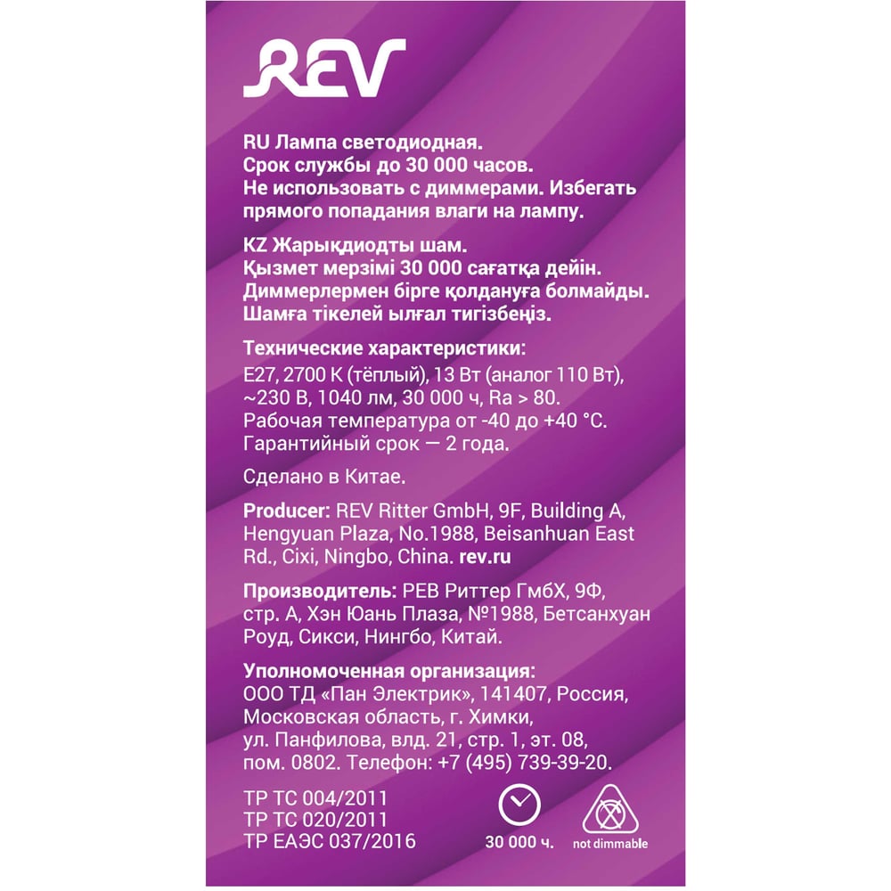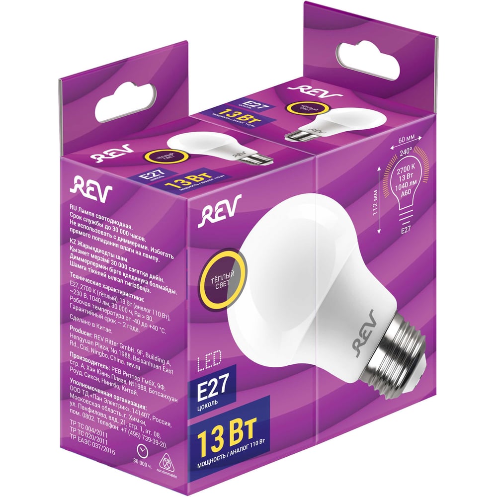 Светодиодная лампа LED A60 Е27 13W 1040 Лм, 2700K, теплый свет REV 32346 4