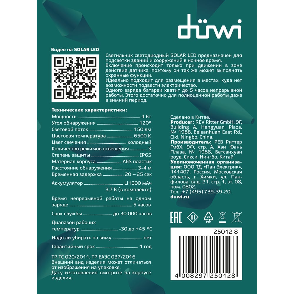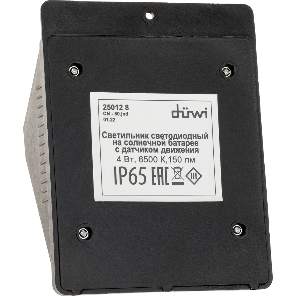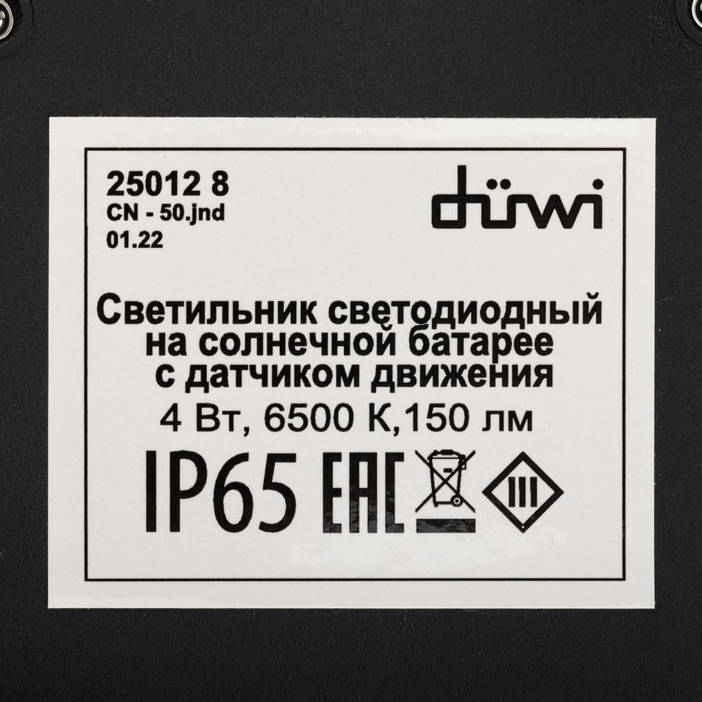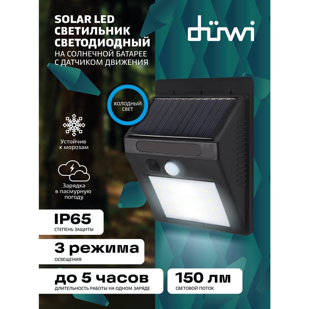 Светодиодный светильник duwi с датчиком движения Solar LED на солнечных батареях, 4Вт, 6500К, 150Лм, IP65, цвет черный 25012 8
