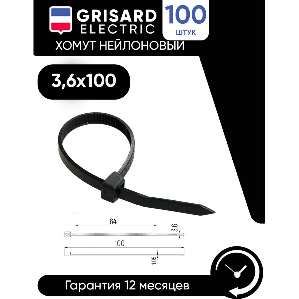 Хомут Grisard Electric 3,6x100 мм, нейлон, черные, 100 шт. GRE-010-0007
