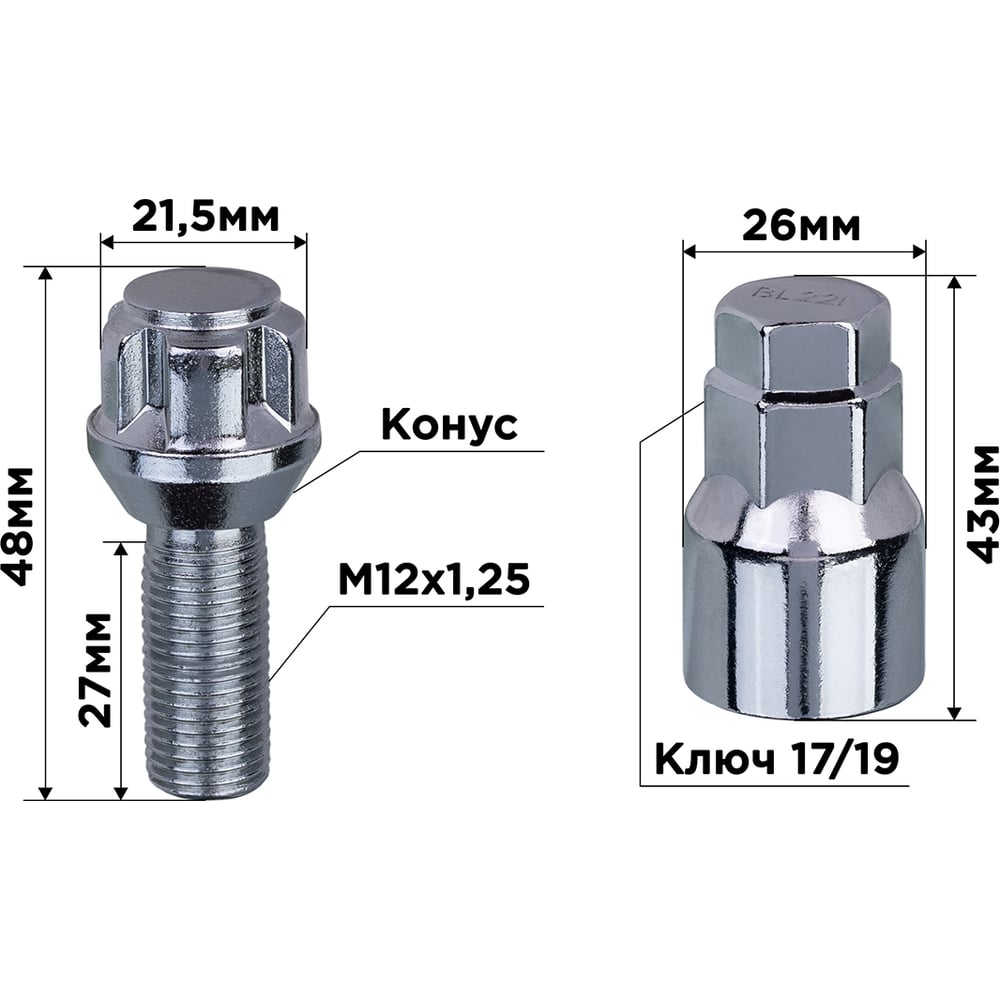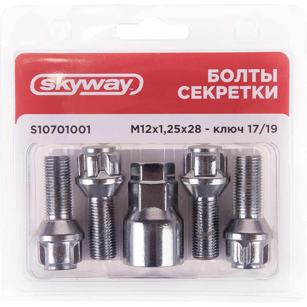 Болты секретки M12x1.25x28 мм, конус 5 луч 1 кл хром 001, 4 шт SKYWAY S10701001