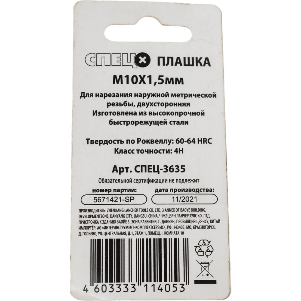 Плашка Спец М10x1,5 мм СПЕЦ-3635