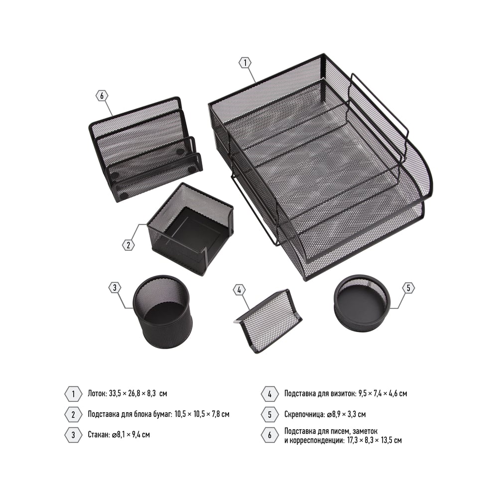 | В наборе | поддоны для бумаг/подставки для бумаг/подставки для канцелярских/пишущих принадлежностей/для визиток |