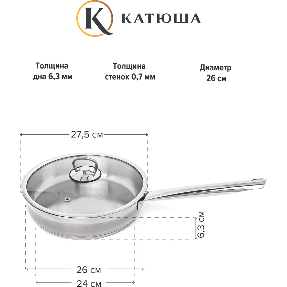 Сковорода Катюша София нержавеющая сталь 26 см, стекл. крышка, арт.29910-260-0