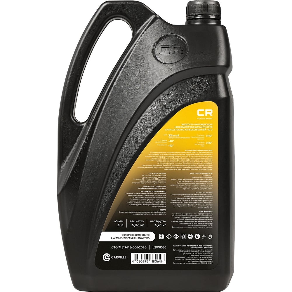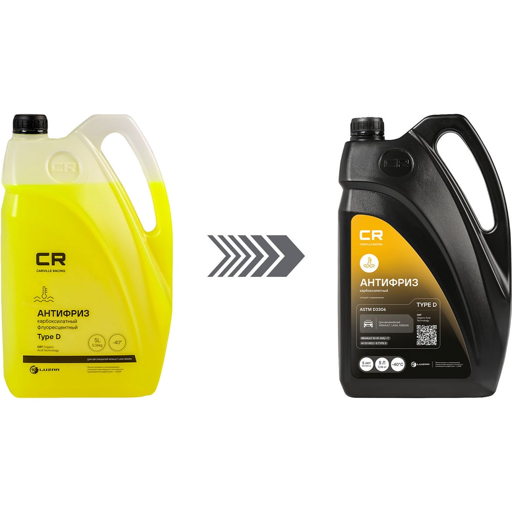 Антифриз CARVILLE RACING CR для а/м Renault/Лада/Nissan, OAT, Type D, флуор. -40С, желтый, готовый L2018536
