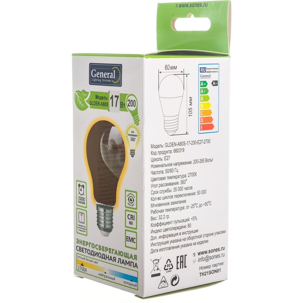 Светодиодная лампа General Lighting Systems Филамент прозрачный E27 17Вт 230В 1480Лм 2700К Теплый белый свет Груша GLDEN-A60S-17-230-E27-2700 660319