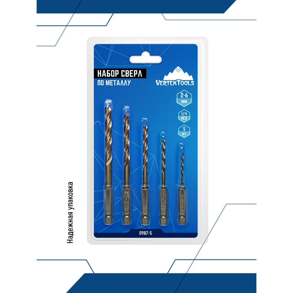 Набор сверл по металлу с шестигранным хвостовиком 5 шт, 2, 3, 4, 5, 6 мм vertextools 0987-5