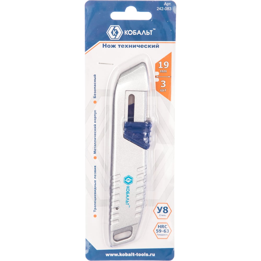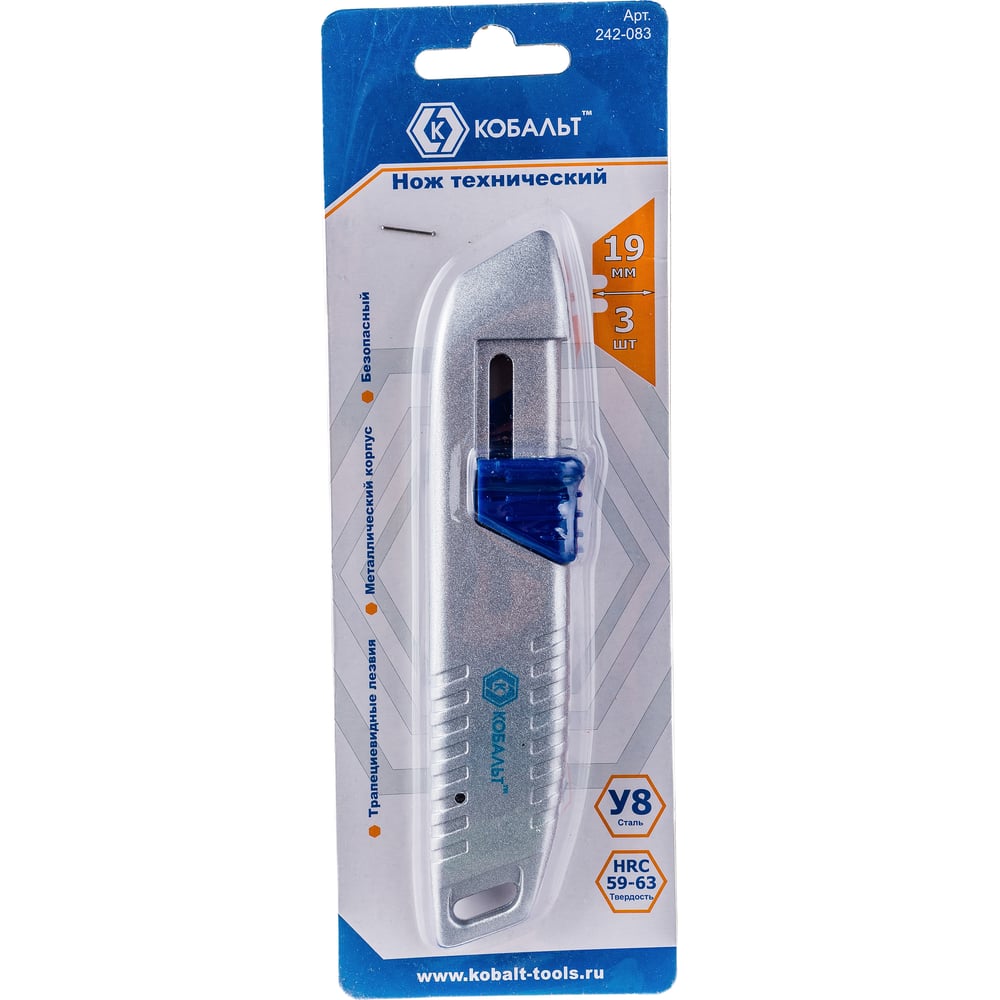 Безопасный технический нож, трапециевидные лезвия 19мм 3шт, металлический корпус КОБАЛЬТ 242-083