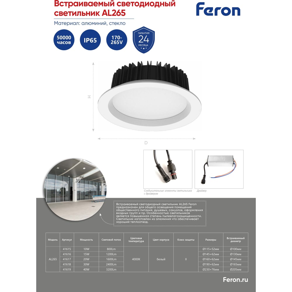 Встраиваемый светодиодный светильник FERON AL265, 15W 4000К, 1200Lm, IP65, 41616
