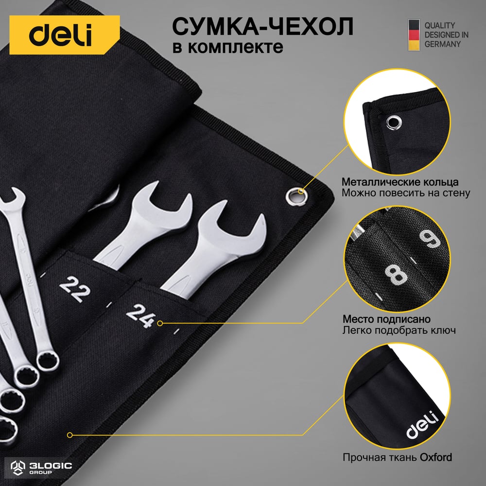Набор комбинированных гаечных ключей DELI DL130014A (Сталь 40Cr, чехол из ткани oxford) 6-24мм/14шт 104509